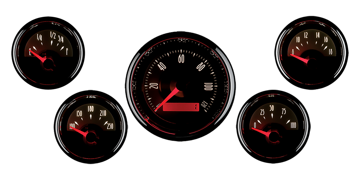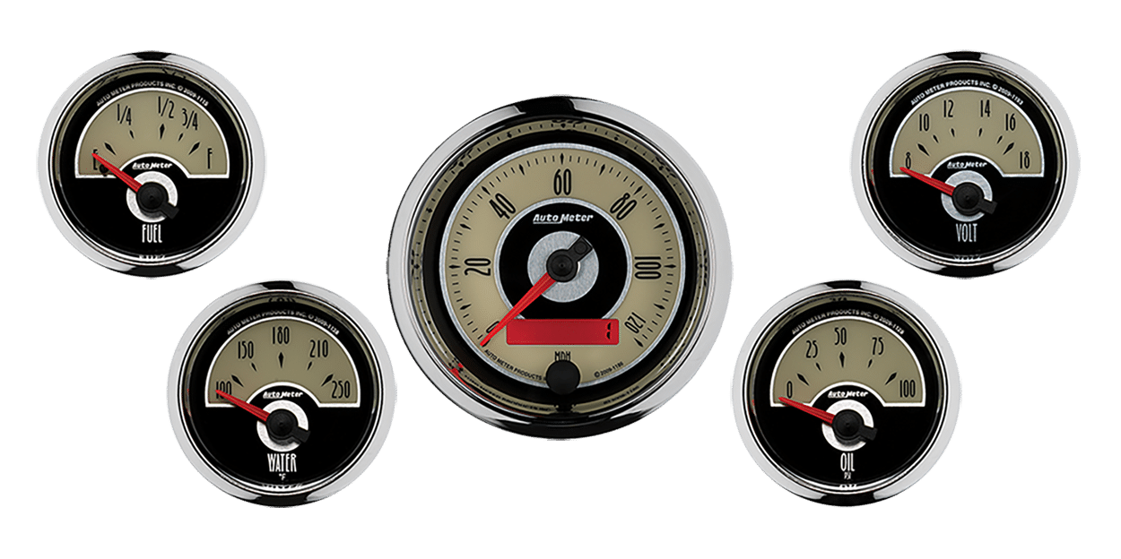 AutoMeter has brought together the most popular gauges into a simple kit. The kit includes a speedometer, water temperature, oil pressure, fuel level, and voltmeter. All senders included where applicable. Feature Points- Modern white LED through-the-dial lighting provides clear visibility during nighttime use