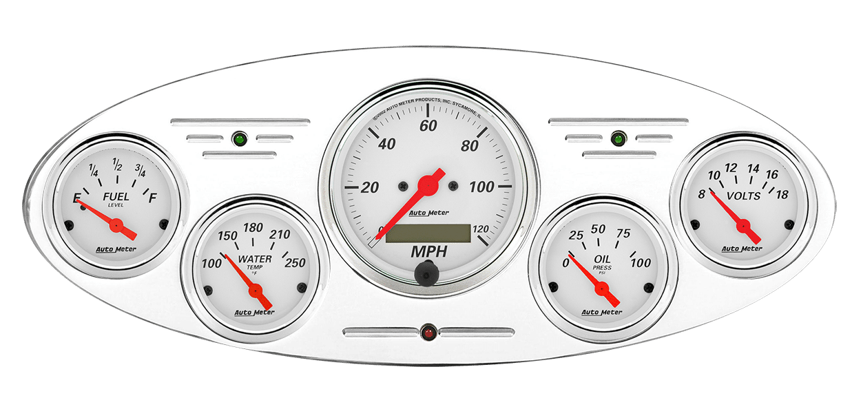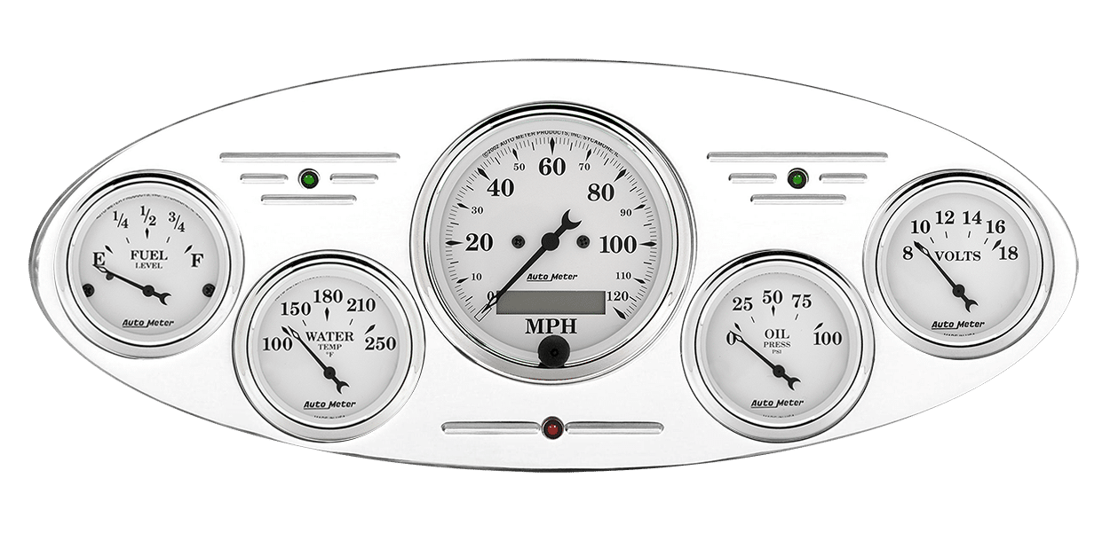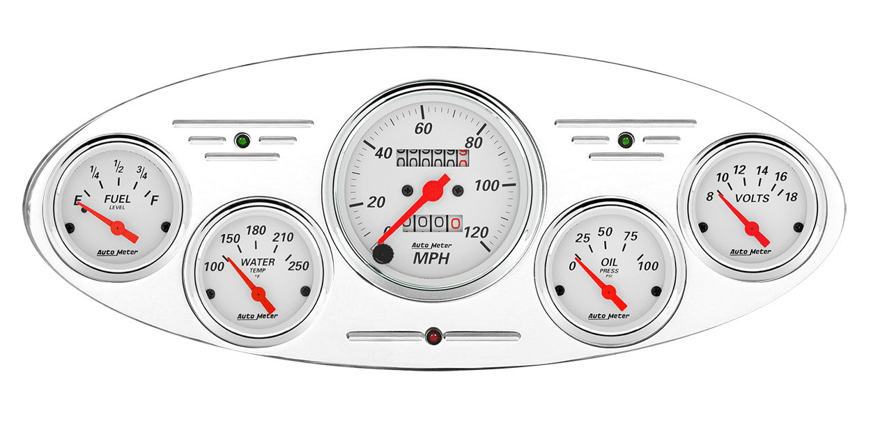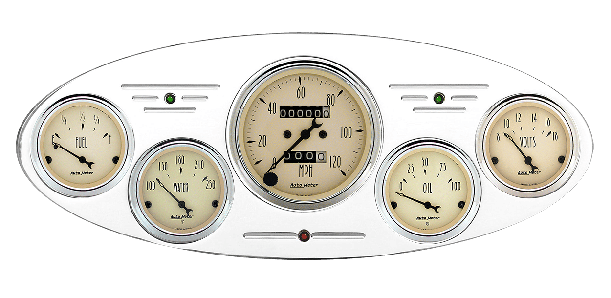 Includes aluminum dash insert, Auto Street Rod series gauges & turn signal/high beam indicators.