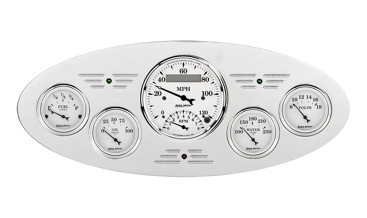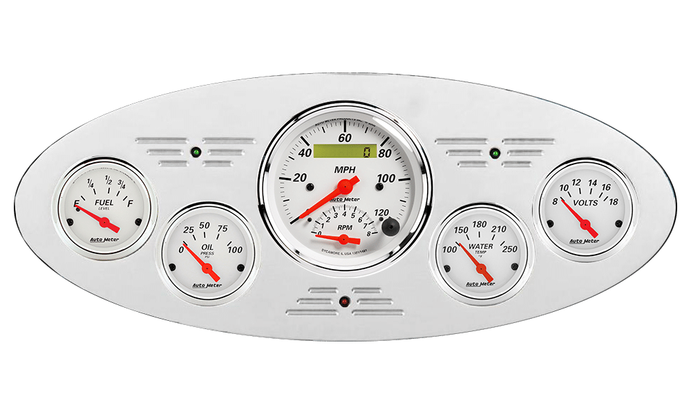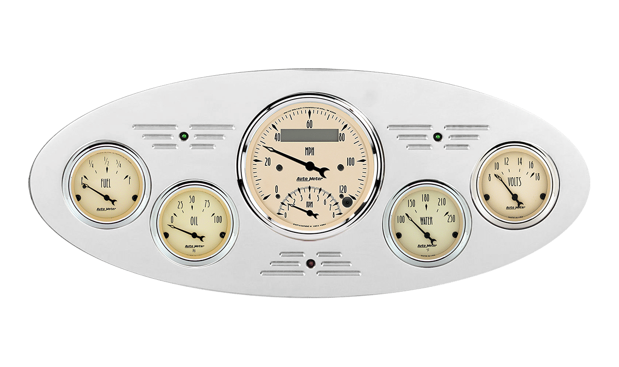 Includes aluminum dash insert, Auto Meter Street Rod series gauges and LED lights (turn signal & high beam indicators.).