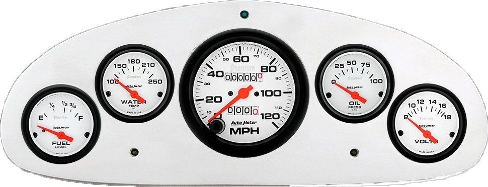Includes aluminum gauge panel, Auto Meter Phantom gauges, & LED lights (turn signal & high beam indicators).