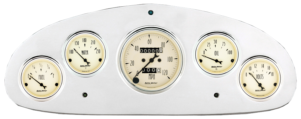 Includes aluminum gauge panel, Auto Street Rod series gauges & turn signal/high beam indicators.