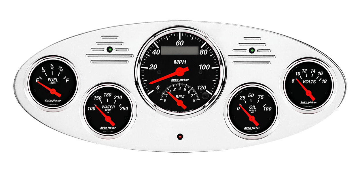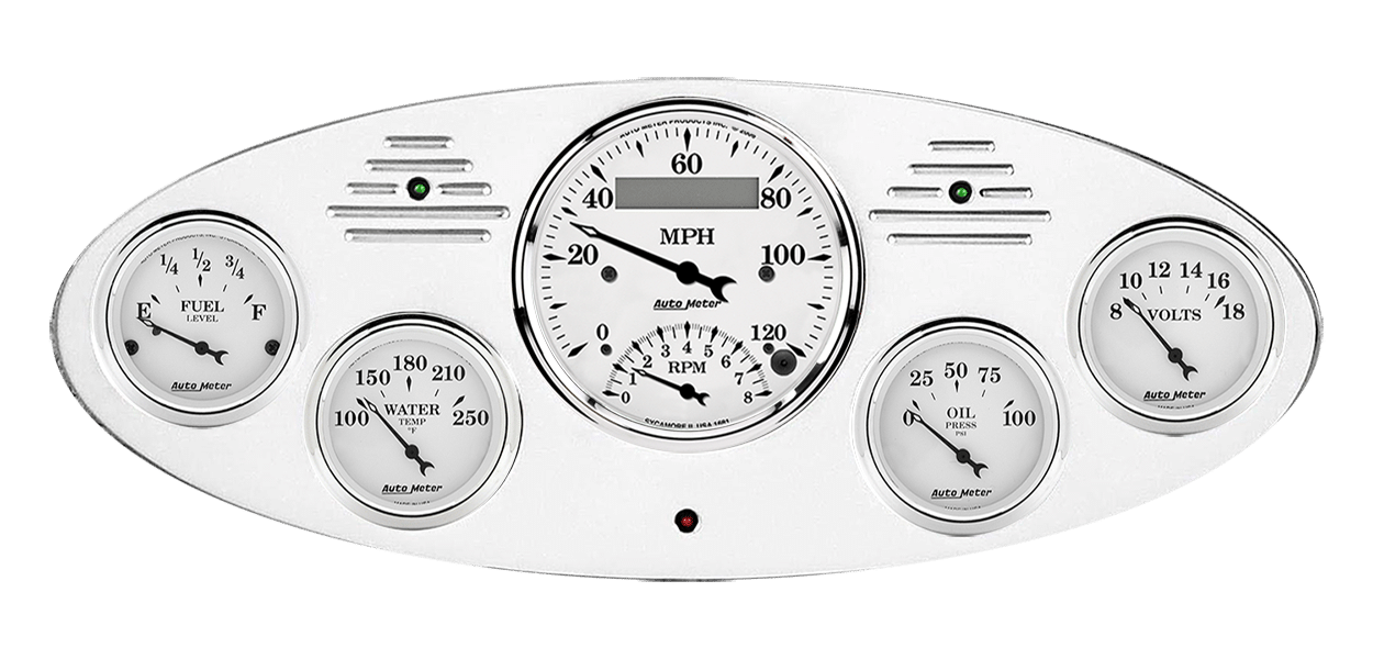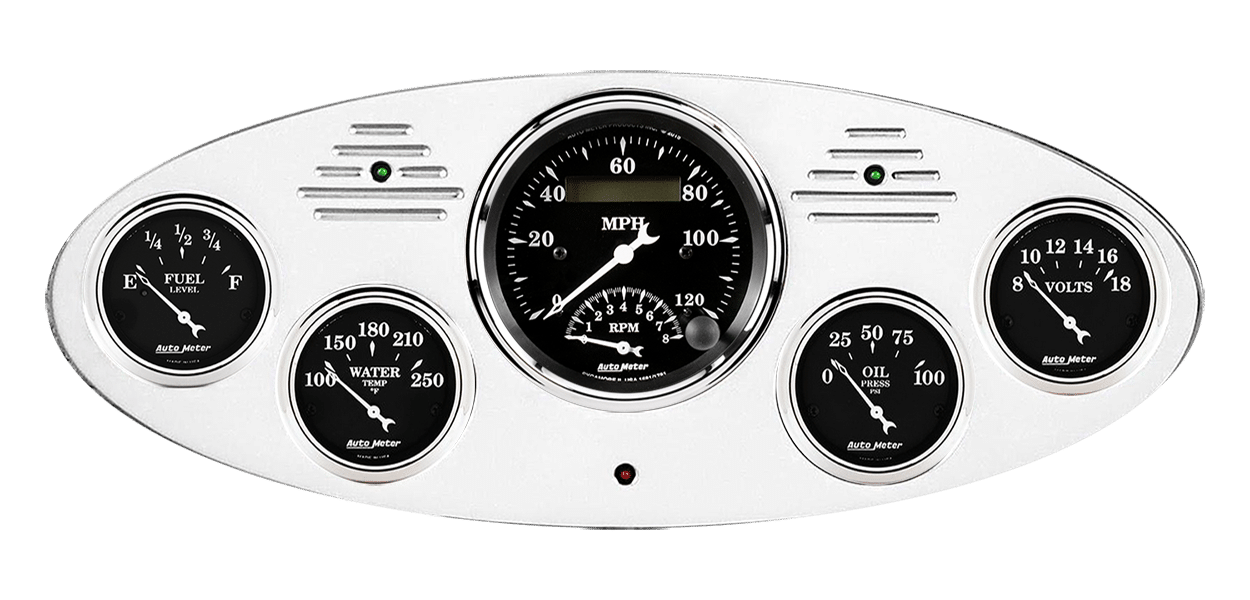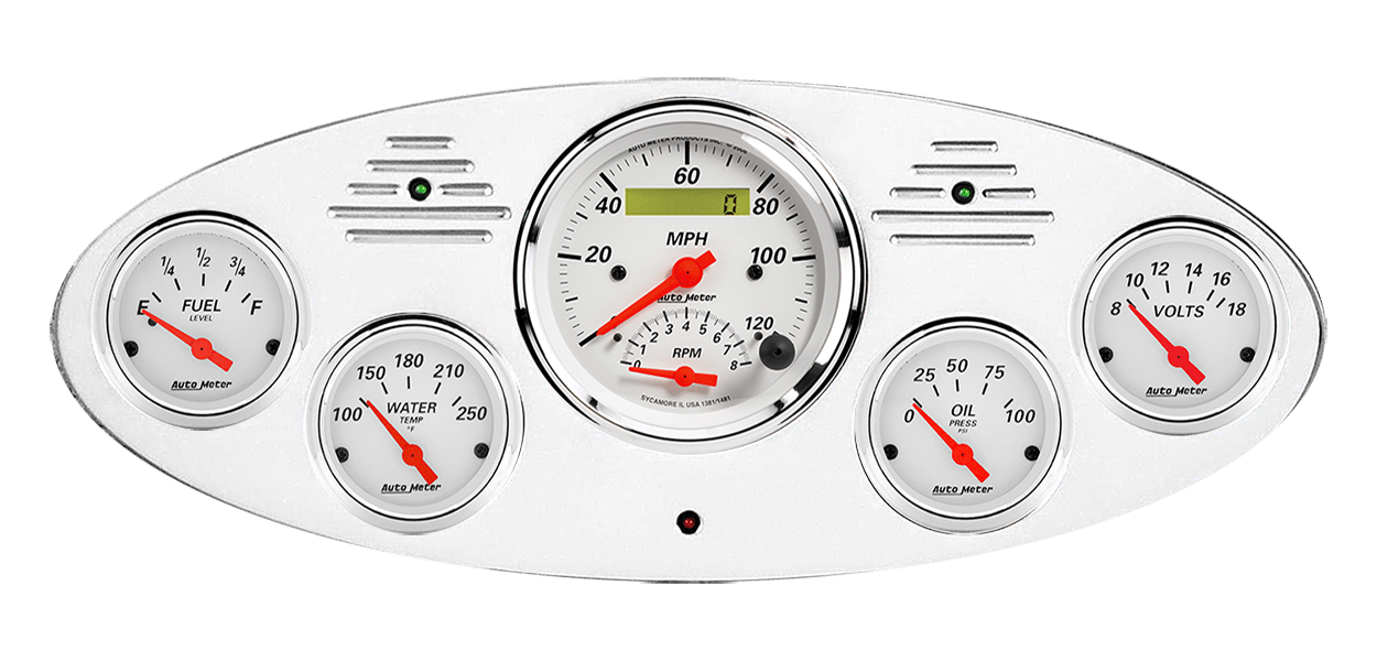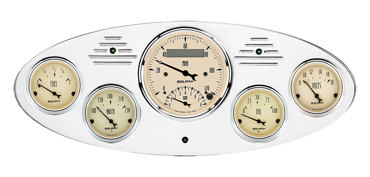 Includes aluminum dash insert, Auto Meter Street Rod series gauges and LED lights (turn signal & high beam indicators.).