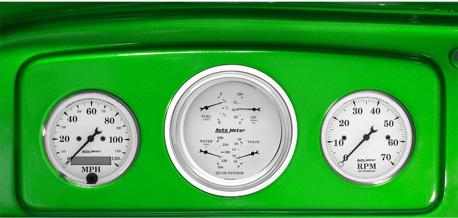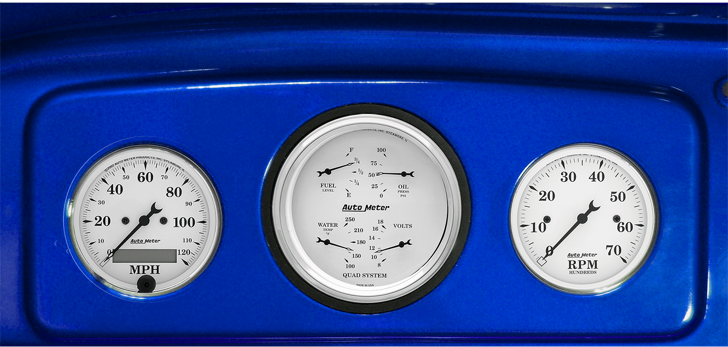 Includes aluminum adapter panels and Auto Meter Old Tyme White gauges.