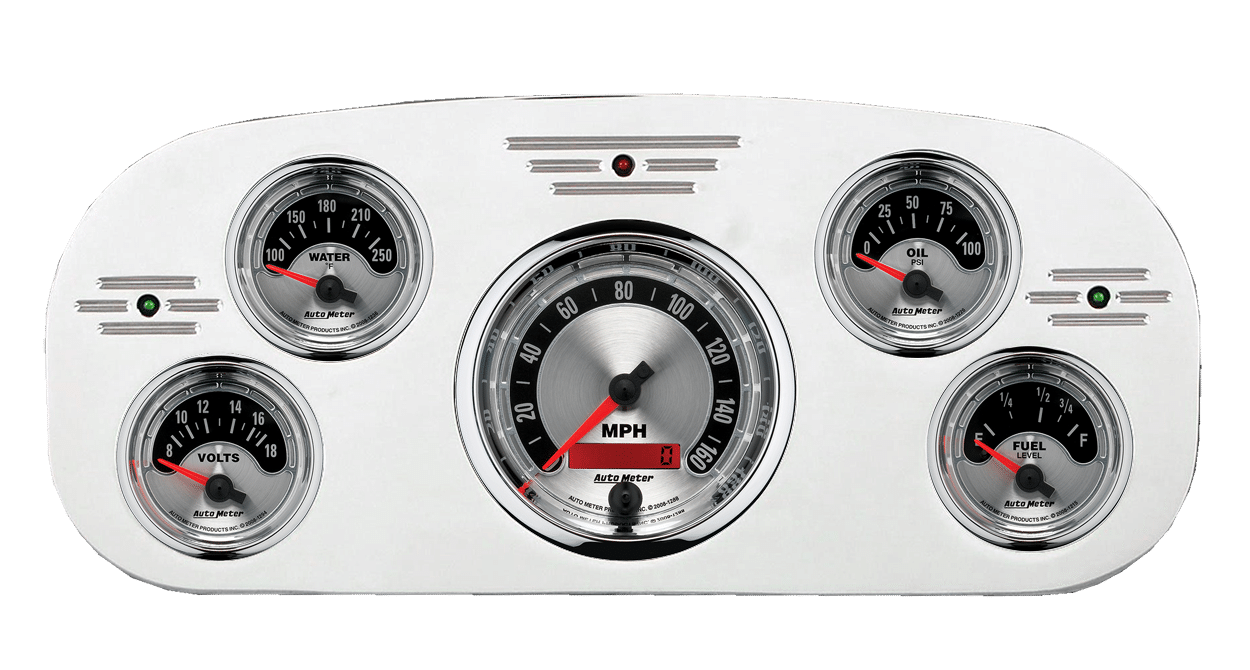 Includes aluminum gauge panel, Auto Meter American Muscle gauges, & LED lights (turn signal & high beam indicators).