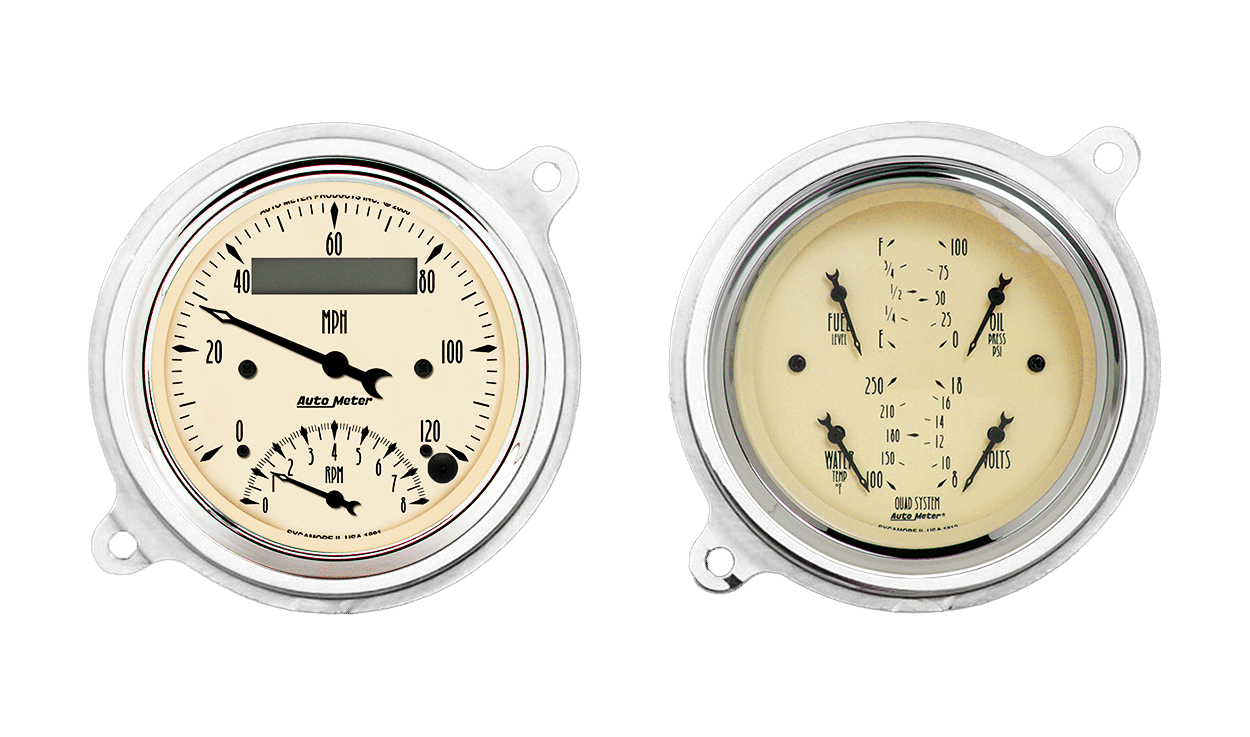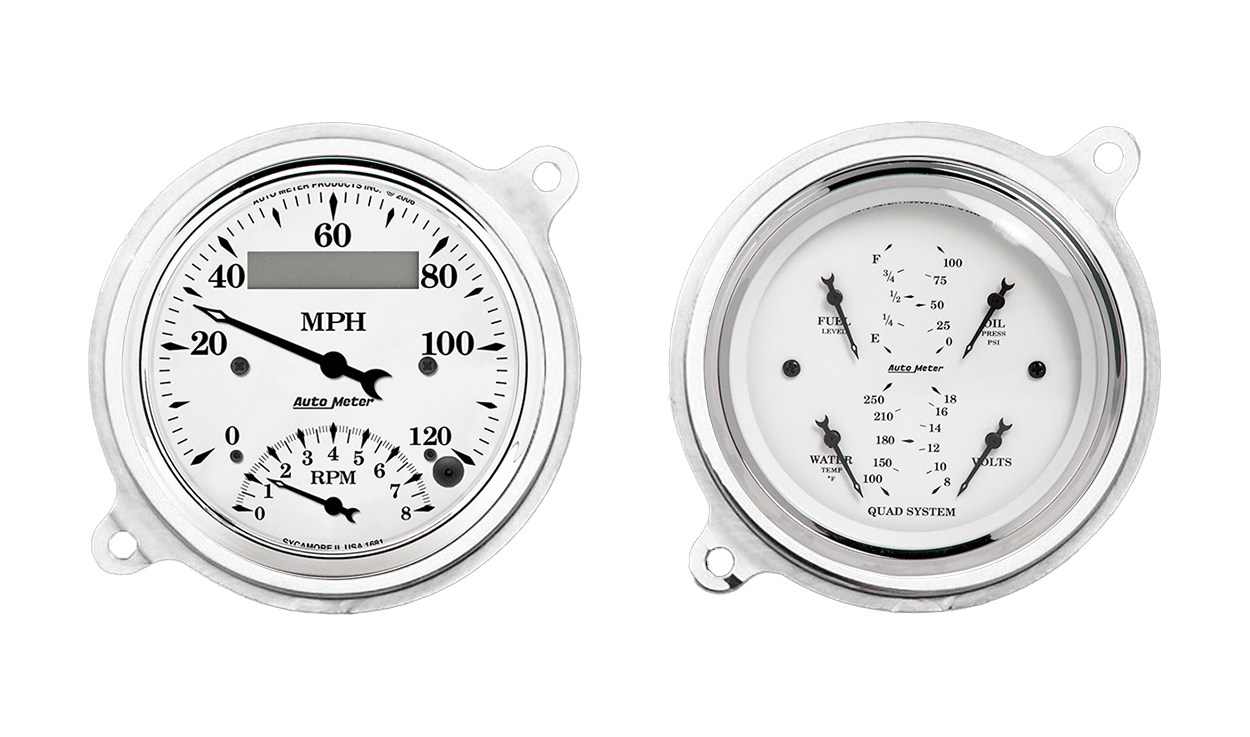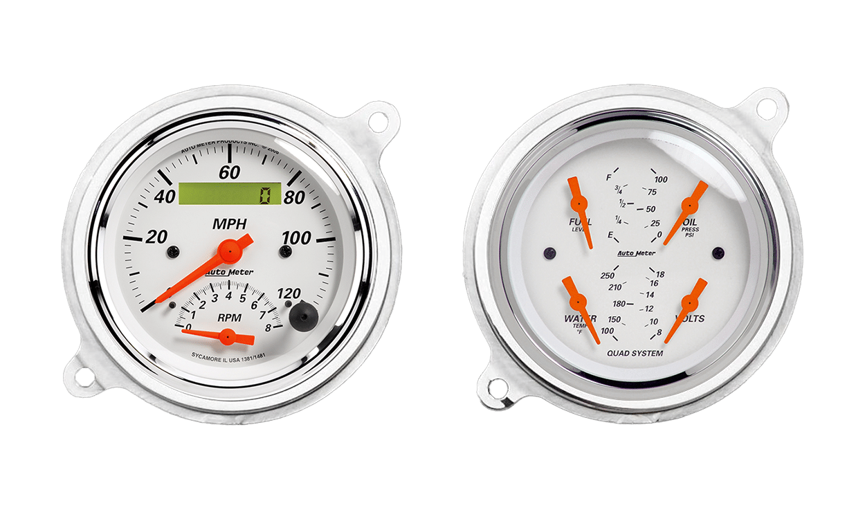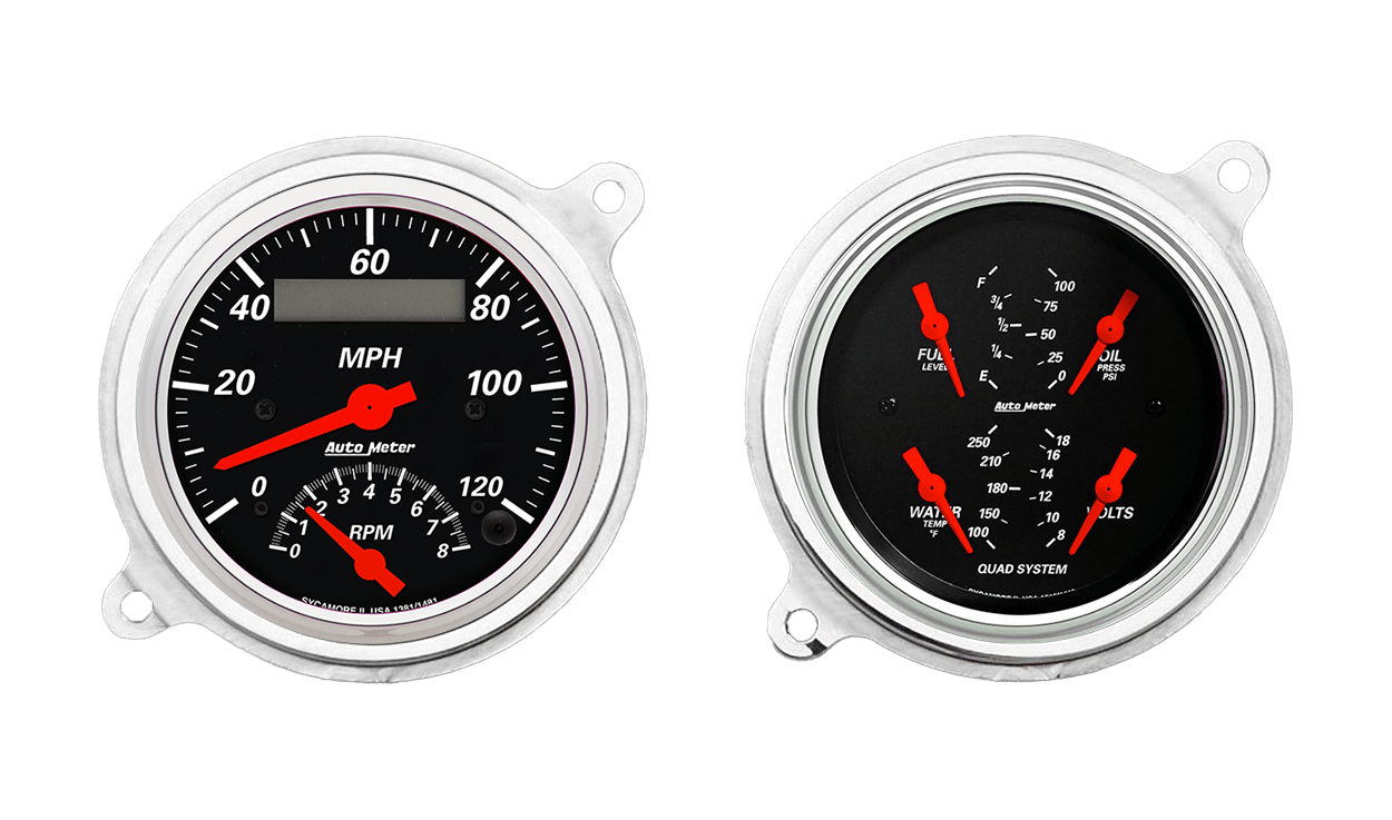 Includes aluminum adatper rings & AutoMeter Street Rod series gauges.