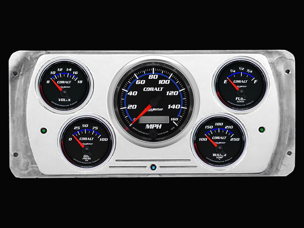 Includes aluminum dash insert, Auto Meter Cobalt gauges, & turn signal/high beam indicators.
