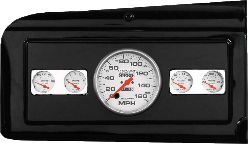 Includes aluminum gauge panel & Auto Meter Ultra-Lite gauges.