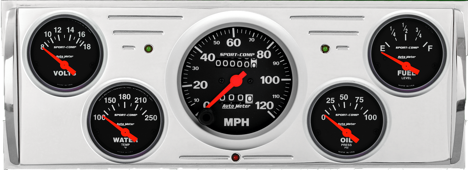Includes aluminum gauge panel, Auto Meter Sport-Comp gauges, & LED lights (turn signal & high beam indicators).