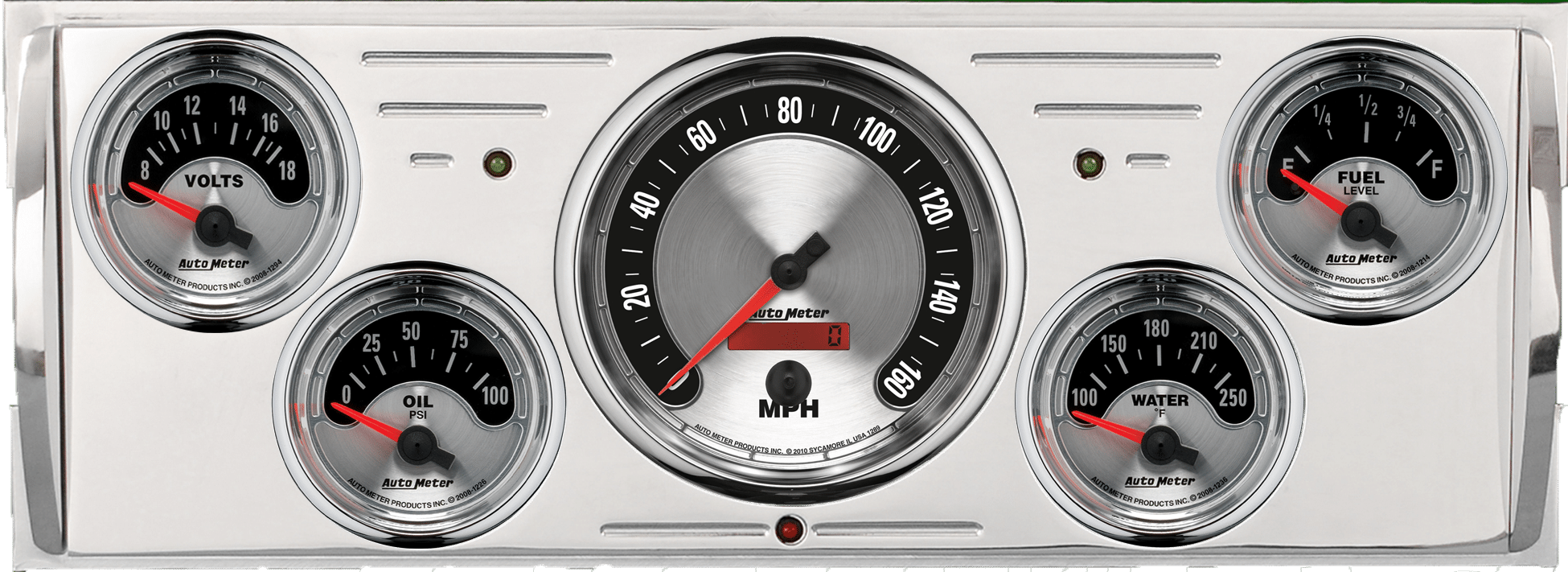 Includes aluminum gauge panel, Auto Meter American Muscle gauges, & LED lights (turn signal & high beam indicators).