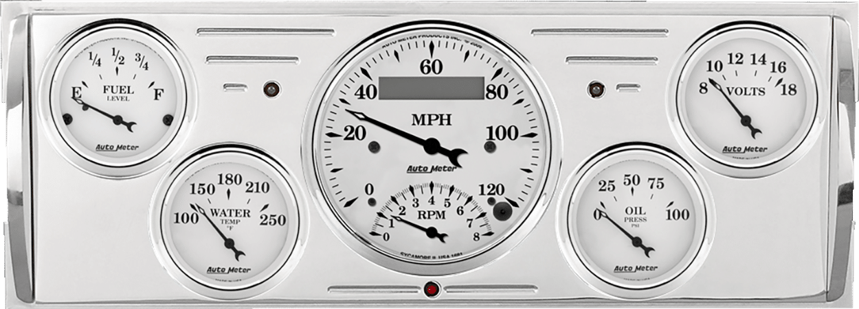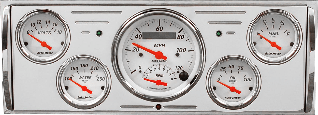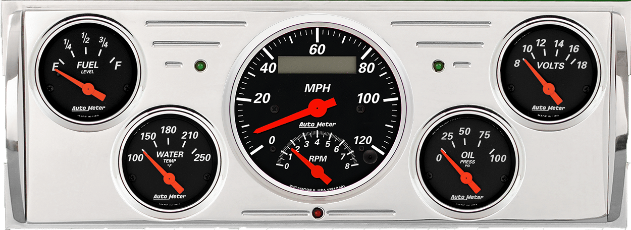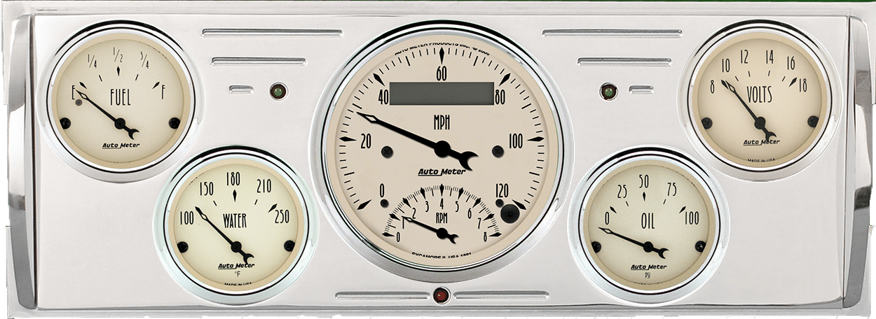 Includes aluminum dash insert, Auto Meter Street Rod series gauges and LED lights (turn signal & high beam indicators.).