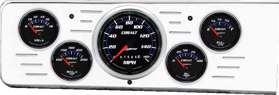 Includes aluminum dash insert, Auto Meter Cobalt gauges, & turn signal/high beam indicators.