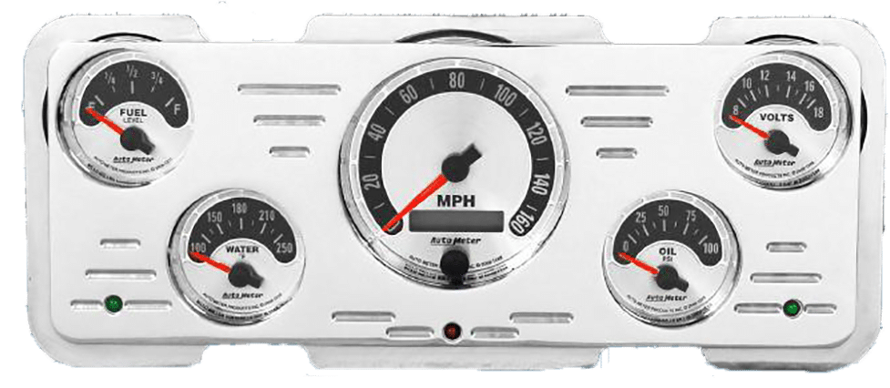 Includes aluminum gauge panel, Auto Meter American Muscle gauges, & LED lights (turn signal & high beam indicators).