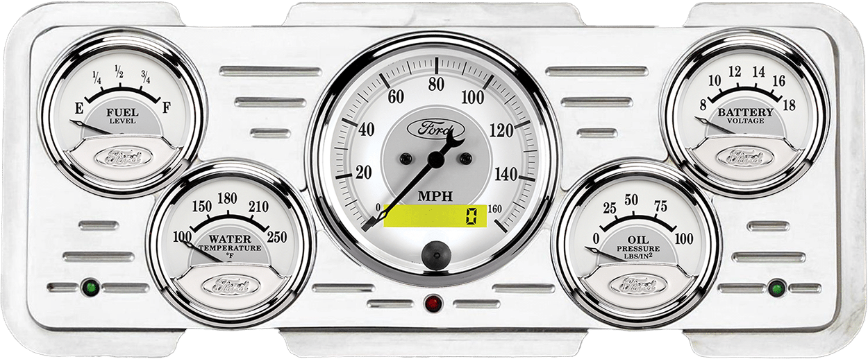 Includes aluminum dash insert, Auto Meter Ford Masterpiece Silver gauges & turn signal/high beam indicators.