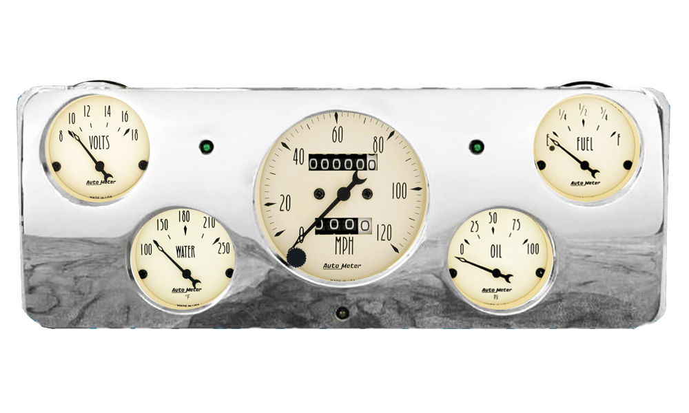 Includes aluminum dash insert, Auto Street Rod series gauges & turn signal/high beam indicators.