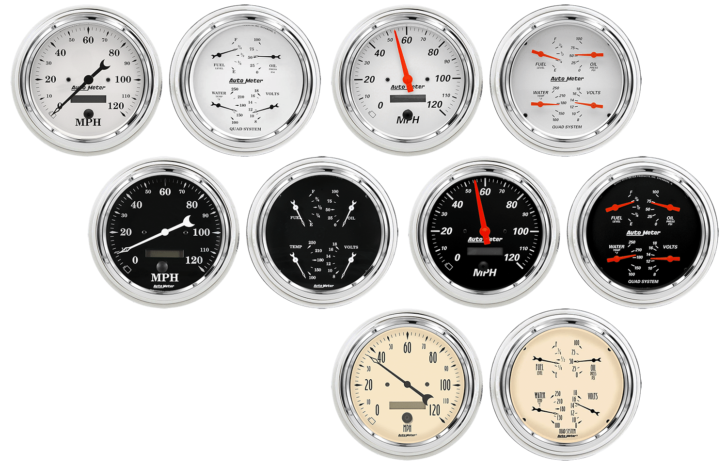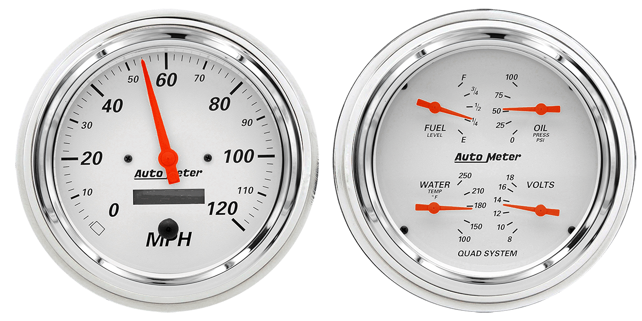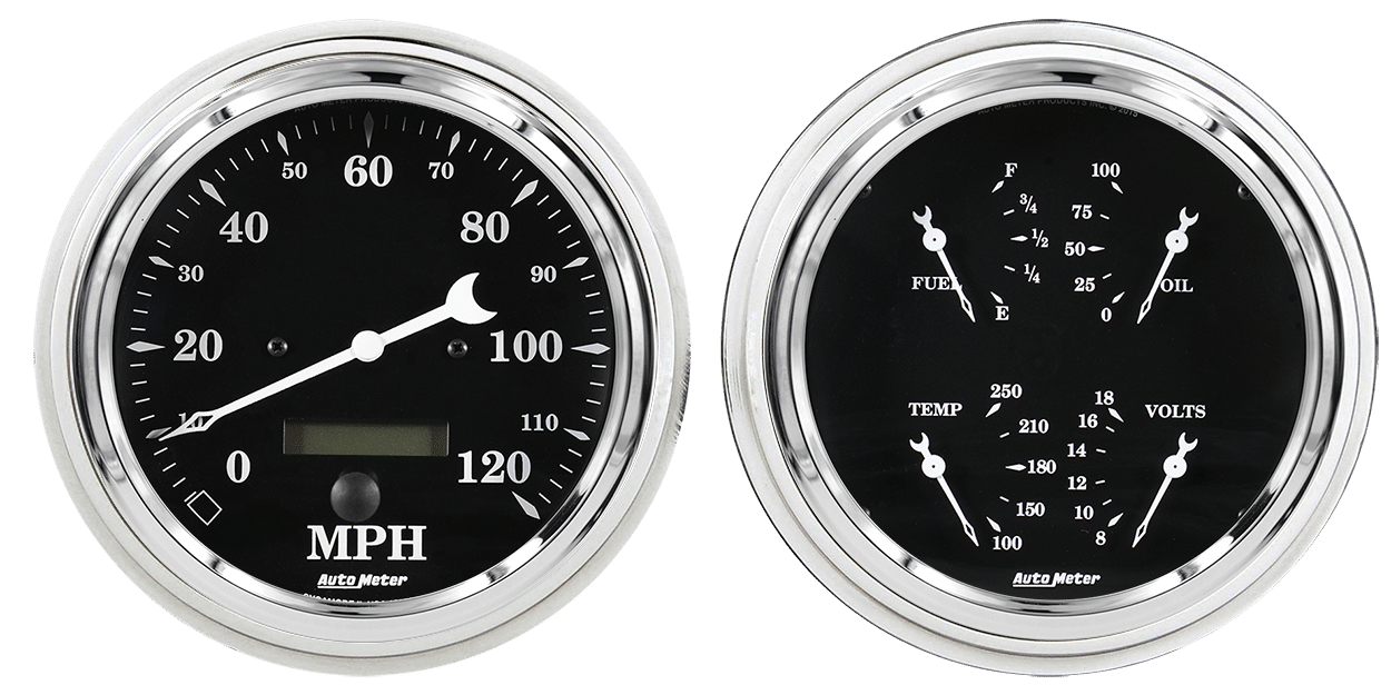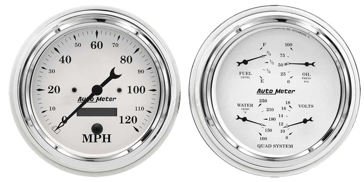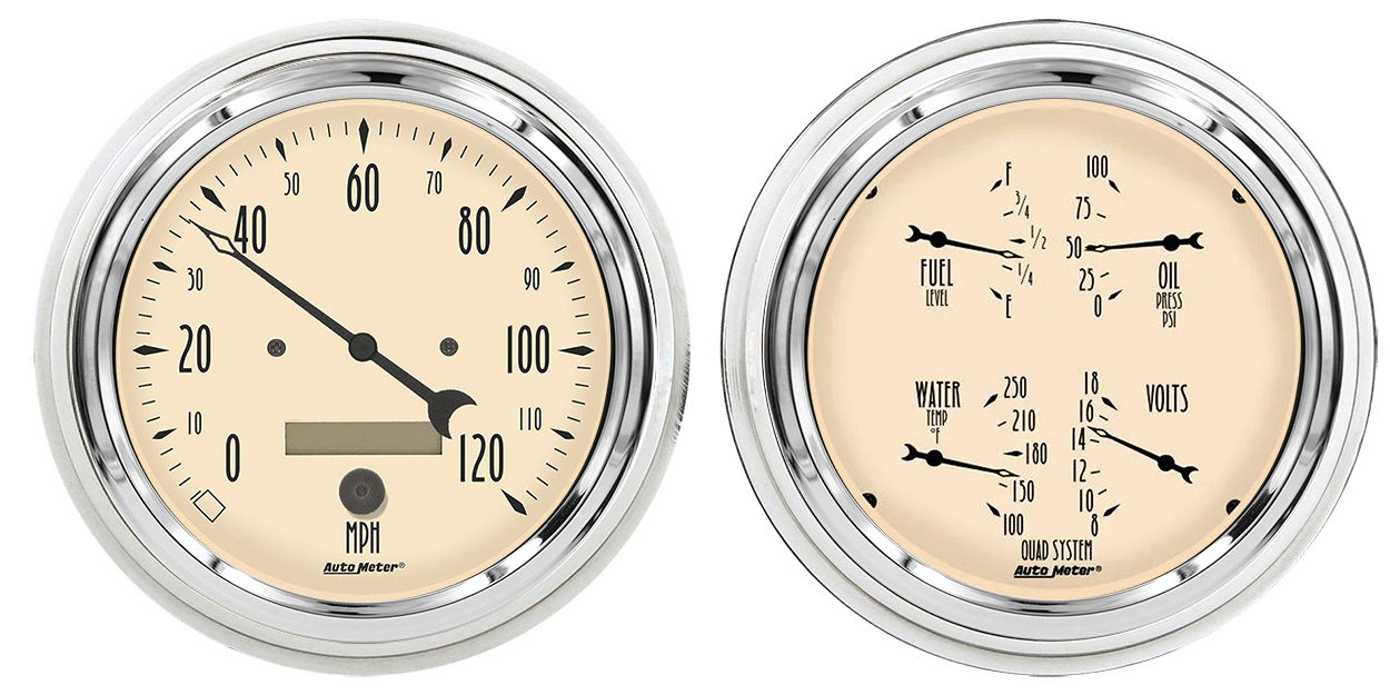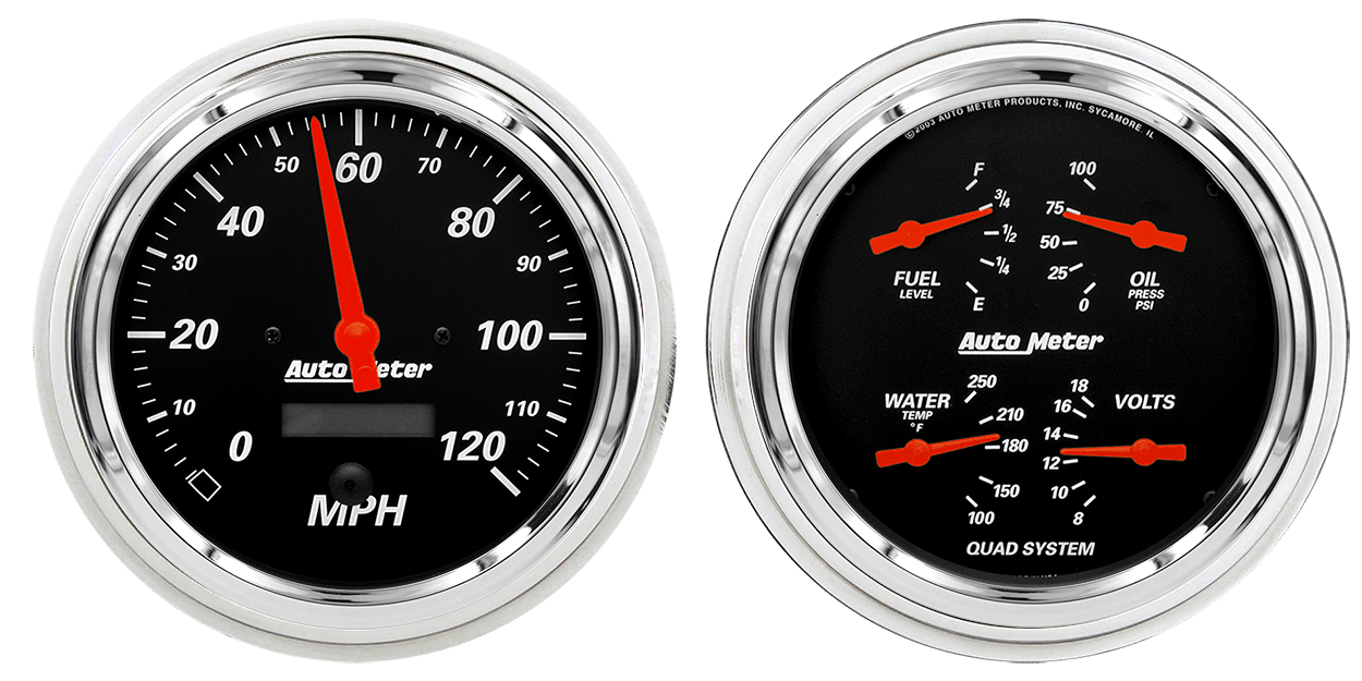 Includes aluminum adapter rings & Auto Meter Street Rod series gauges.