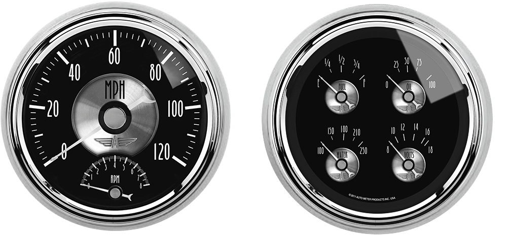 Includes aluminum adapter rings & Auto Meter Prestige series gauges.