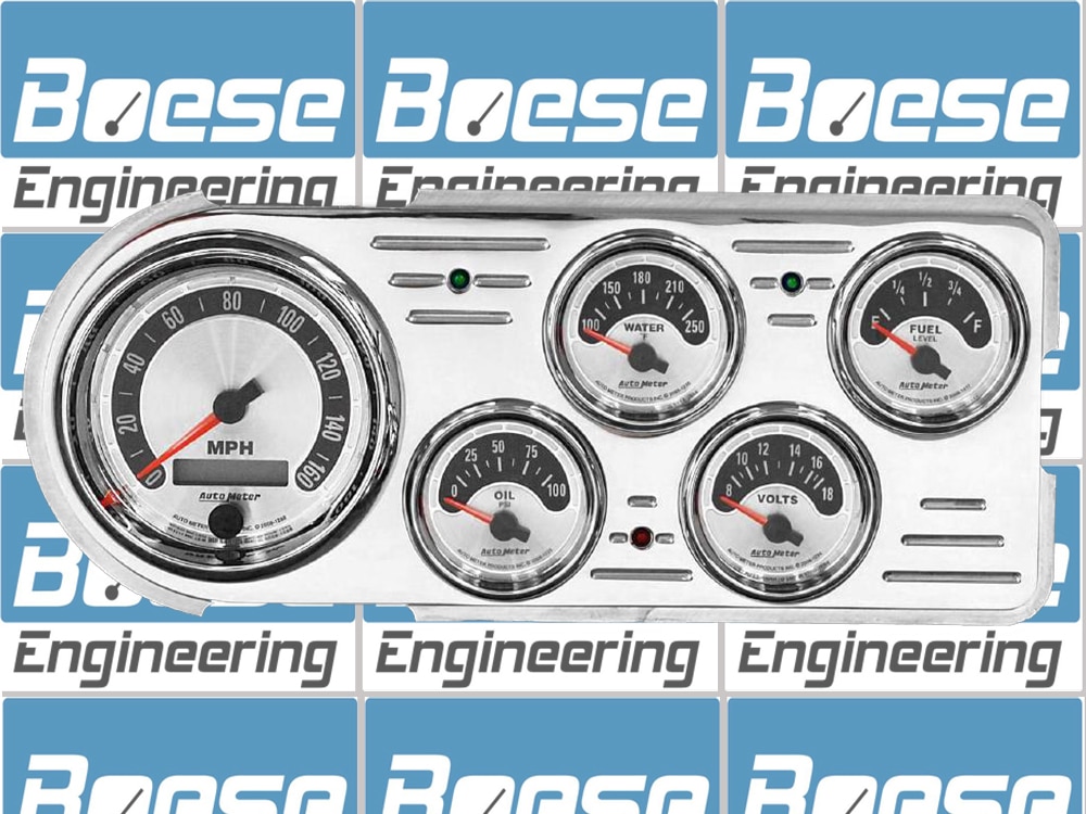 Includes aluminum gauge panel, Auto Meter American Muscle gauges, & LED lights (turn signal & high beam indicators).