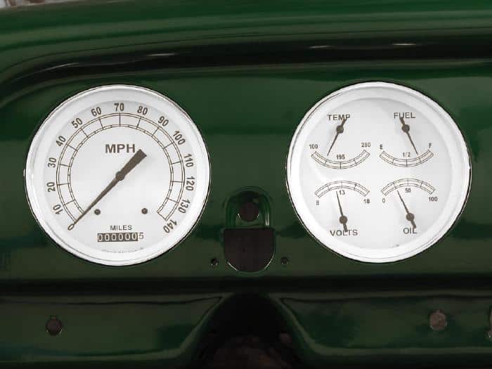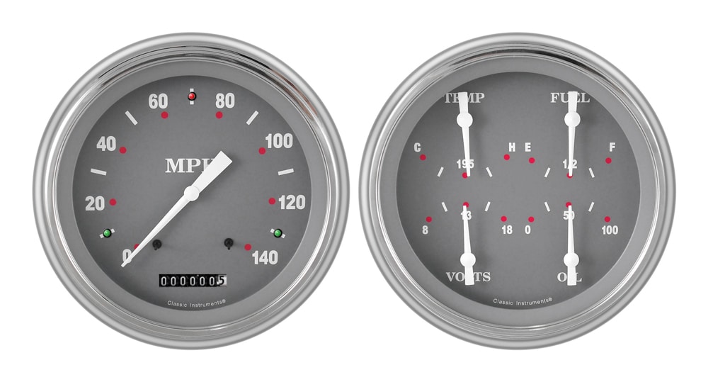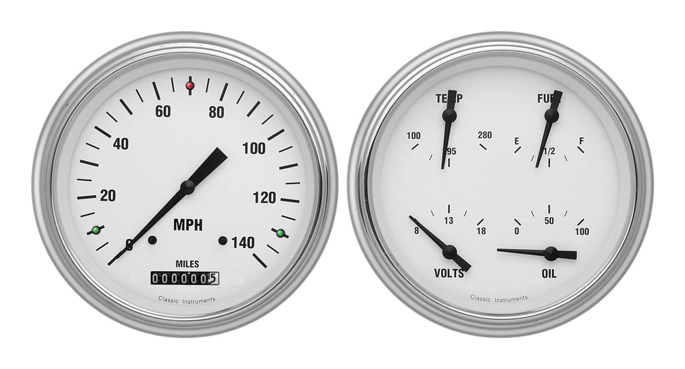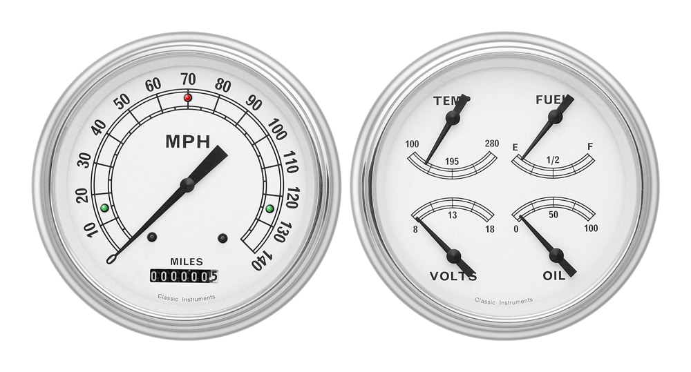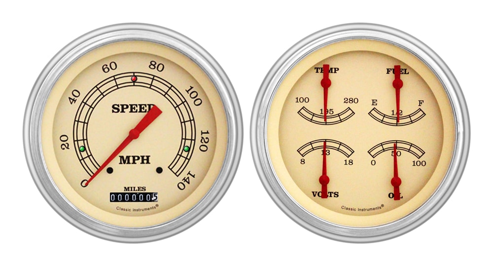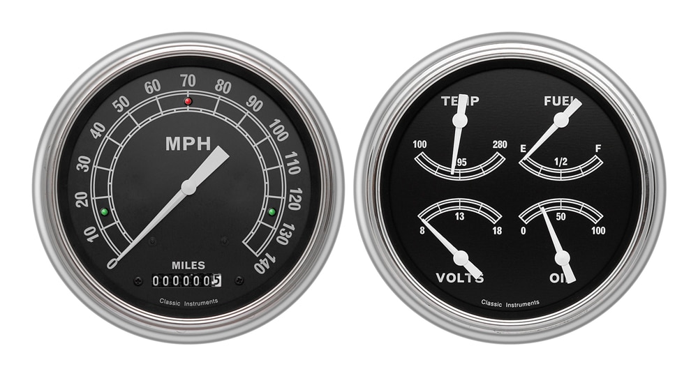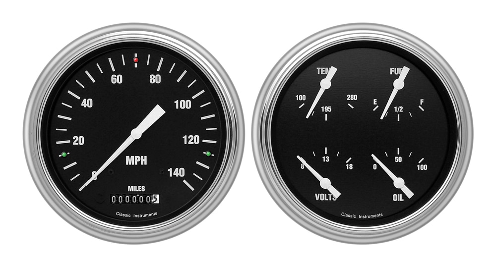 This 1951-52 Chevy package includes a 4 5/8″ speedometer & 4 5/8″ Quad gauge (fuel (0-30), oil, temp, & volts). The set includes a red high beam and green turn signal LED indicator lights in the speedometer, model specific trim rings, mounting hardware, and all the necessary sending units. The 0-30 fuel gauge is calibrated for use with the vehicle’s stock fuel tank sending unit. Backed by Classic Instruments 7 year warranty.