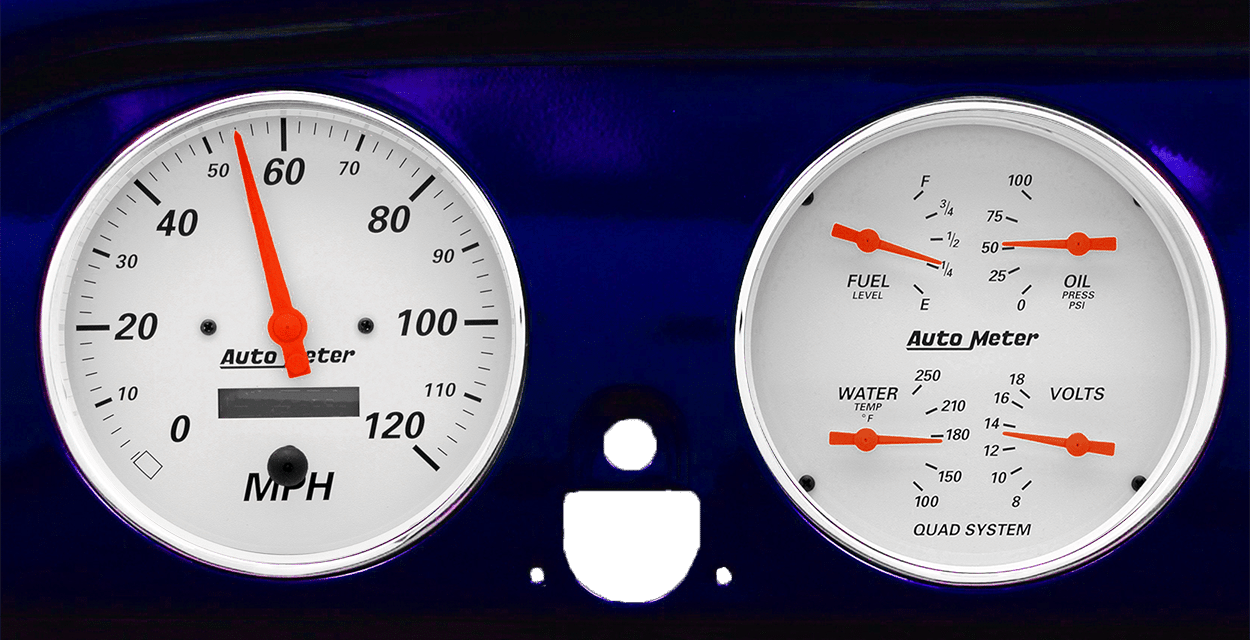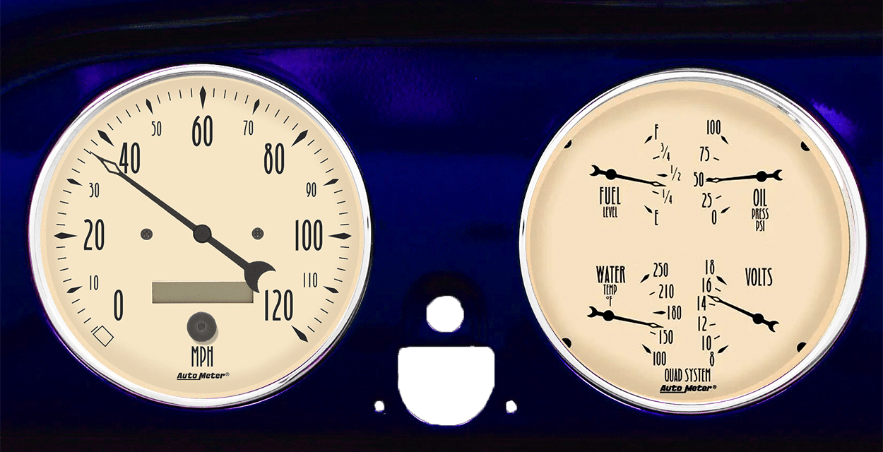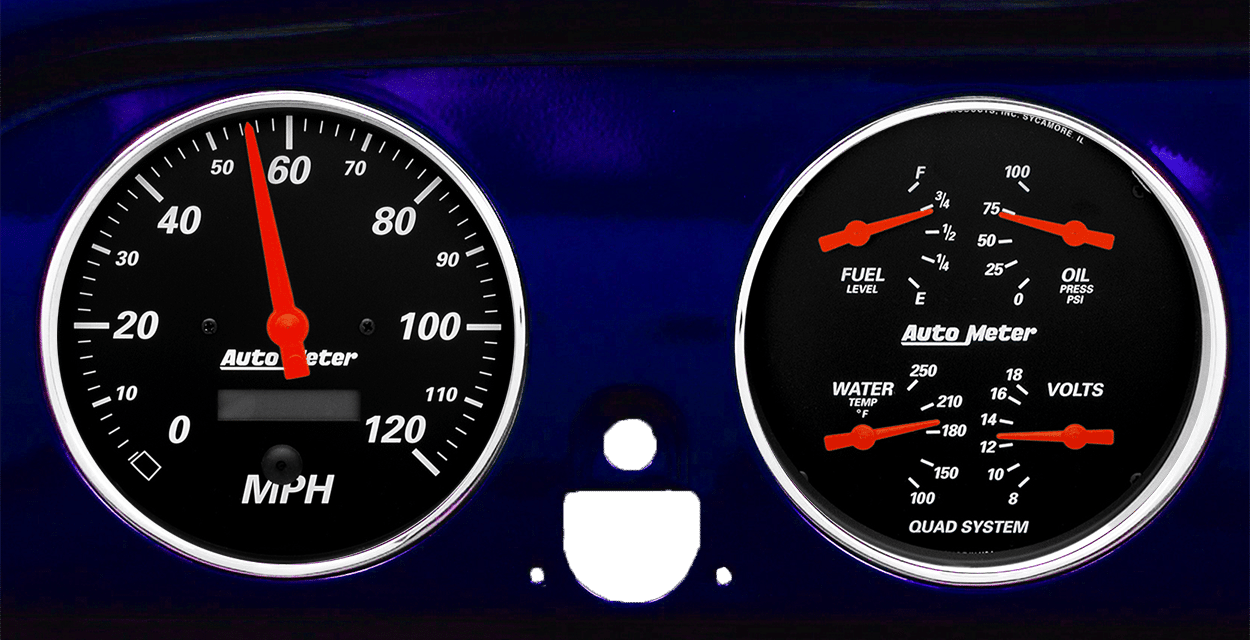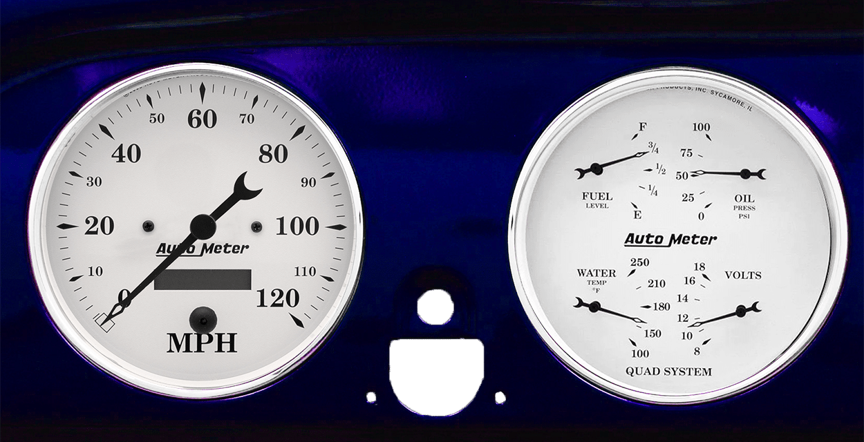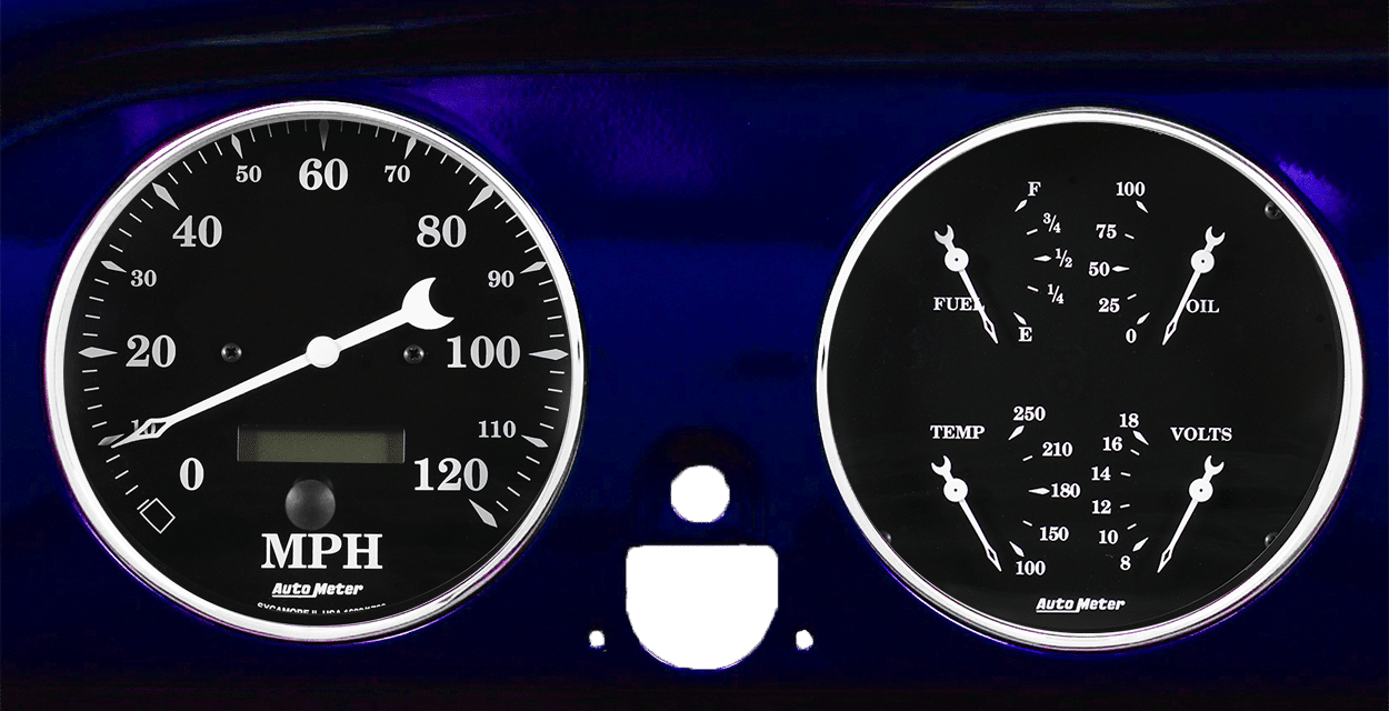 Includes aluminum adapter rings & Auto Meter Street Rod series gauges.