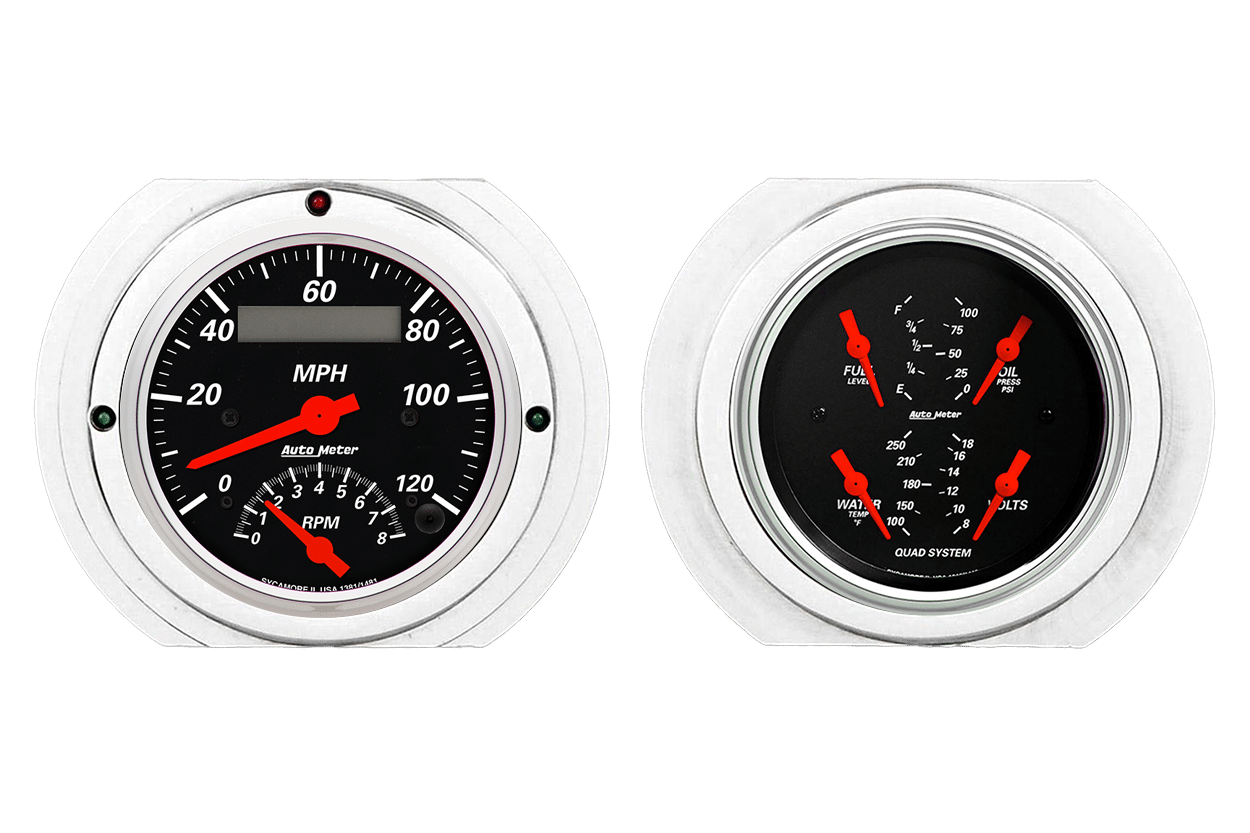 Includes aluminum dash insert, Auto Meter Street Rod series gauges and LED lights (turn signal & high beam indicators.).