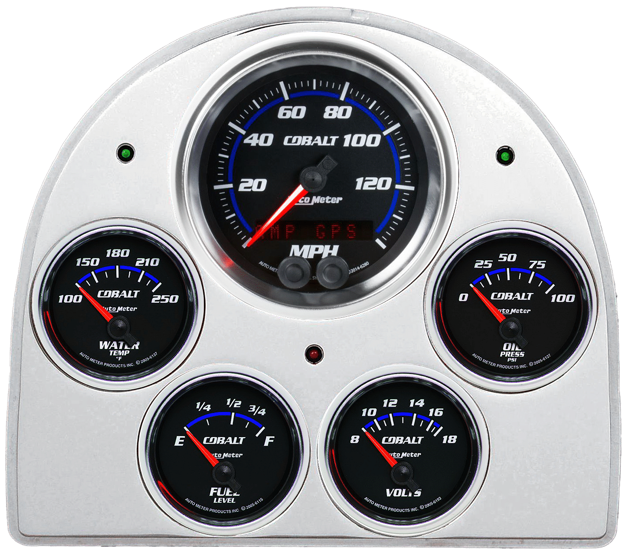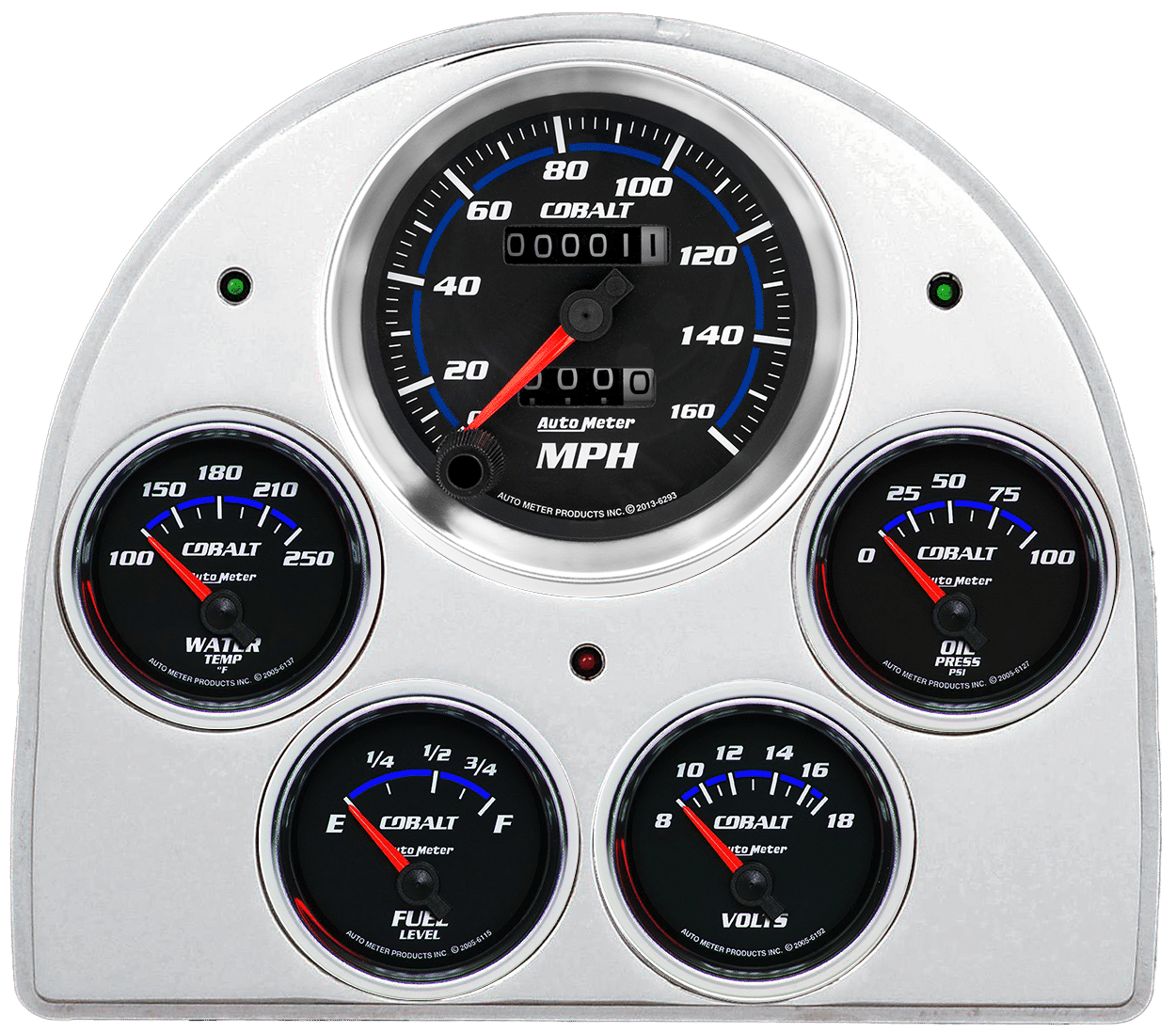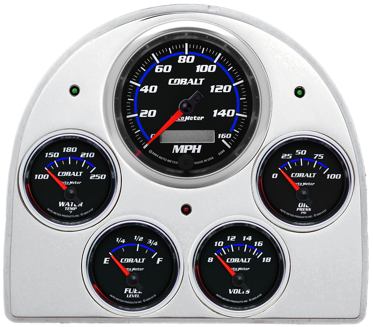 Includes aluminum dash insert, Auto Meter Cobalt gauges, & turn signal/high beam indicators.