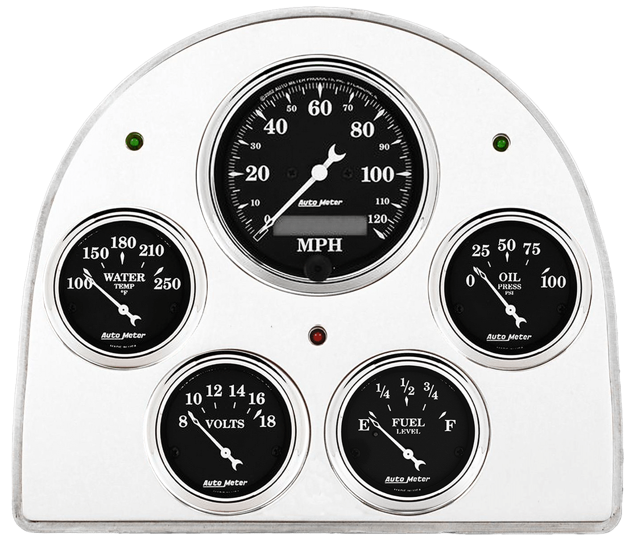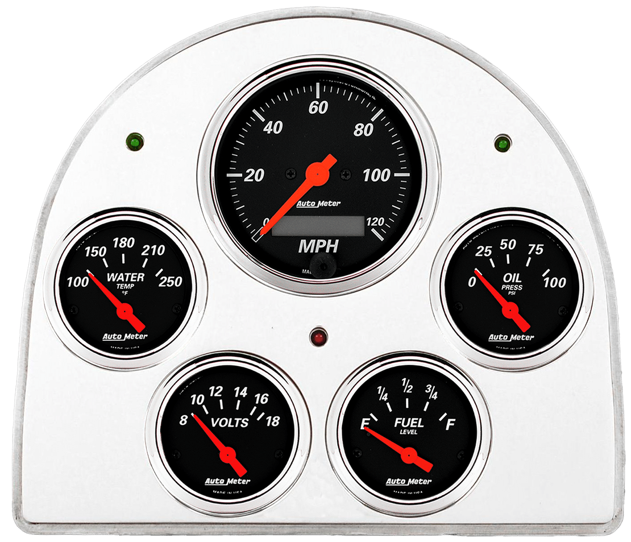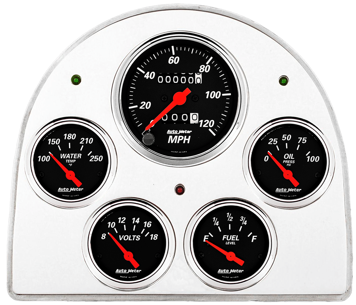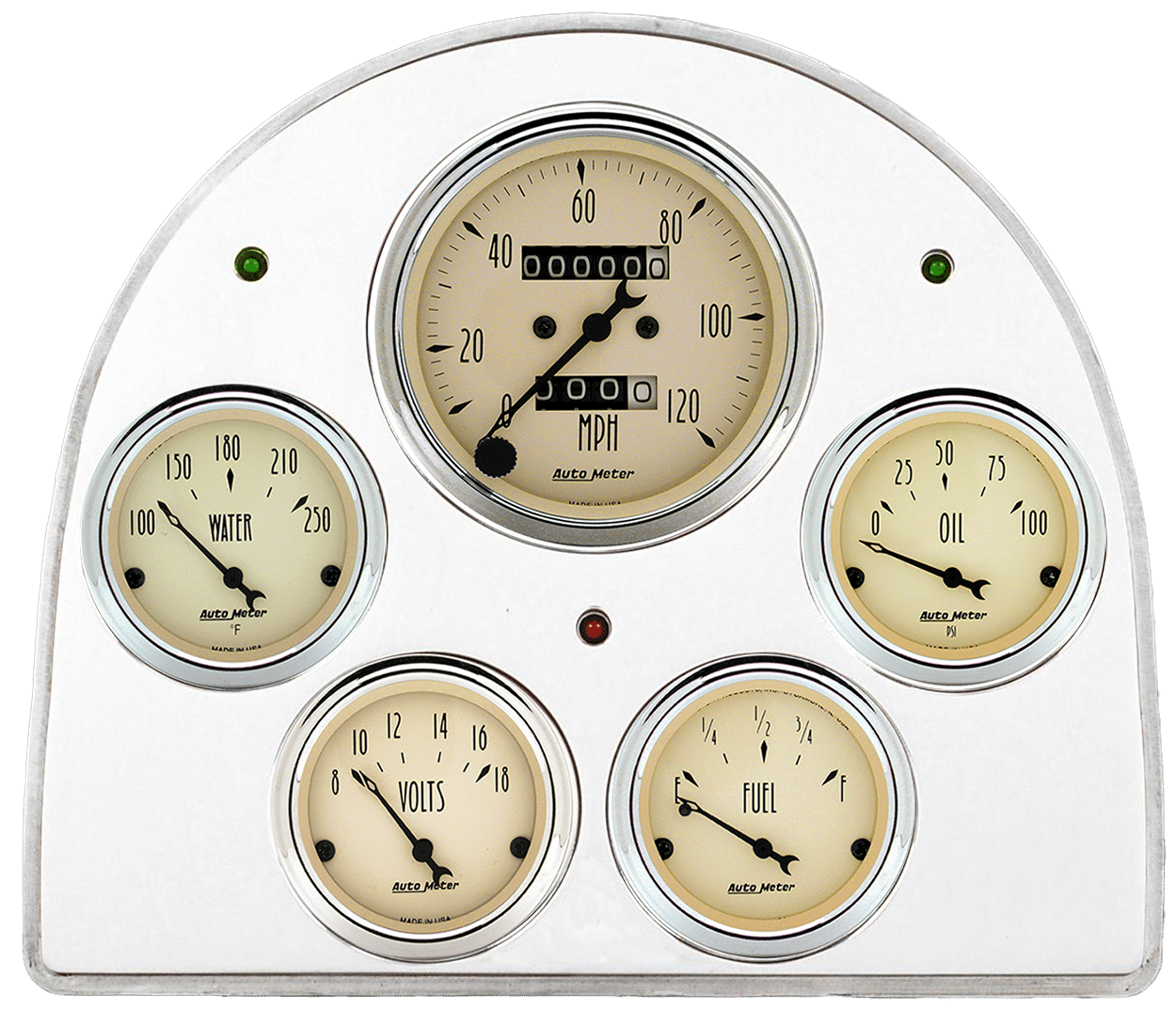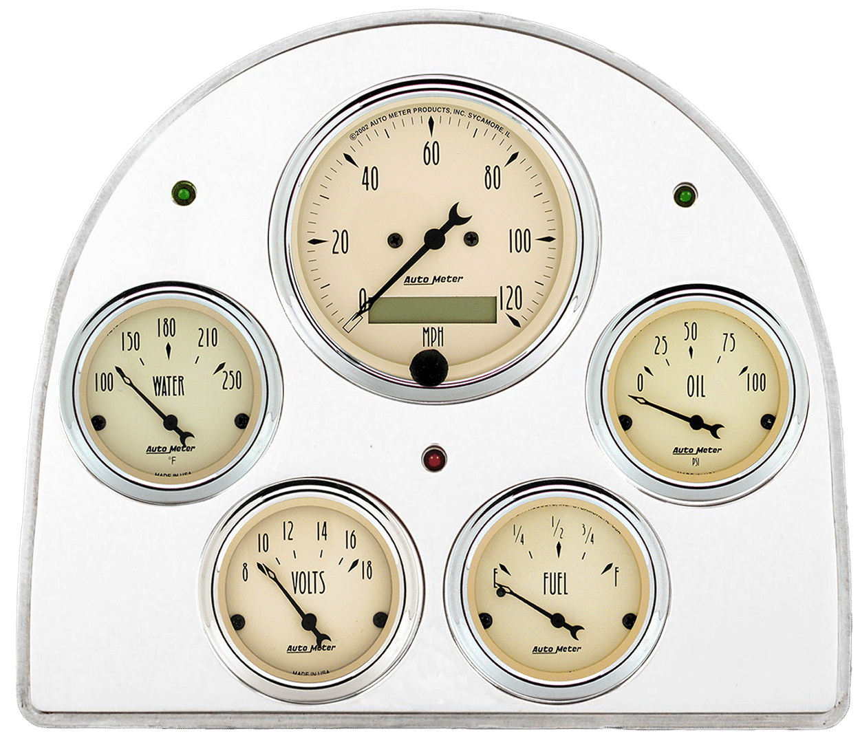 Includes aluminum dash insert, Auto Street Rod series gauges & turn signal/high beam indicators.