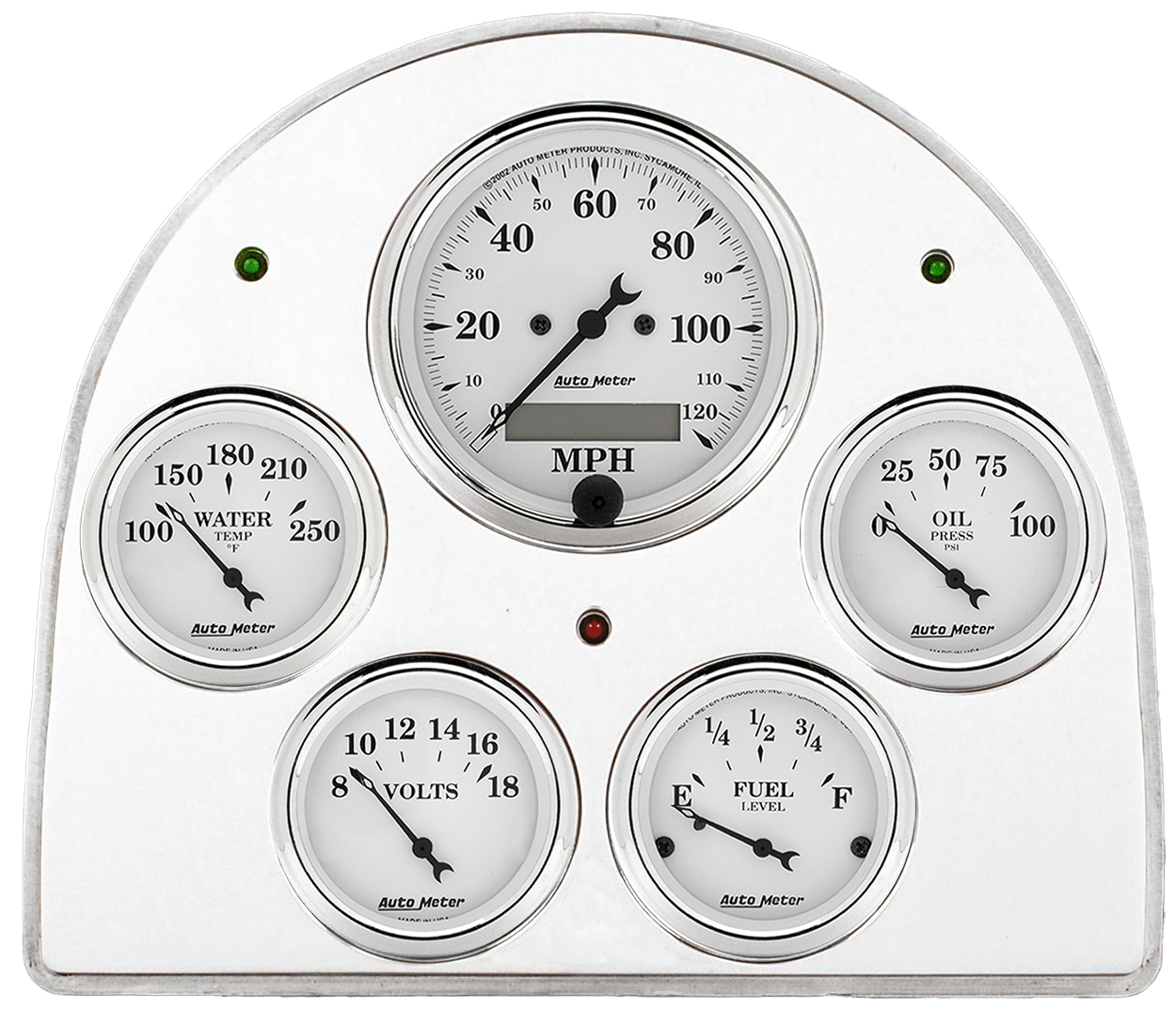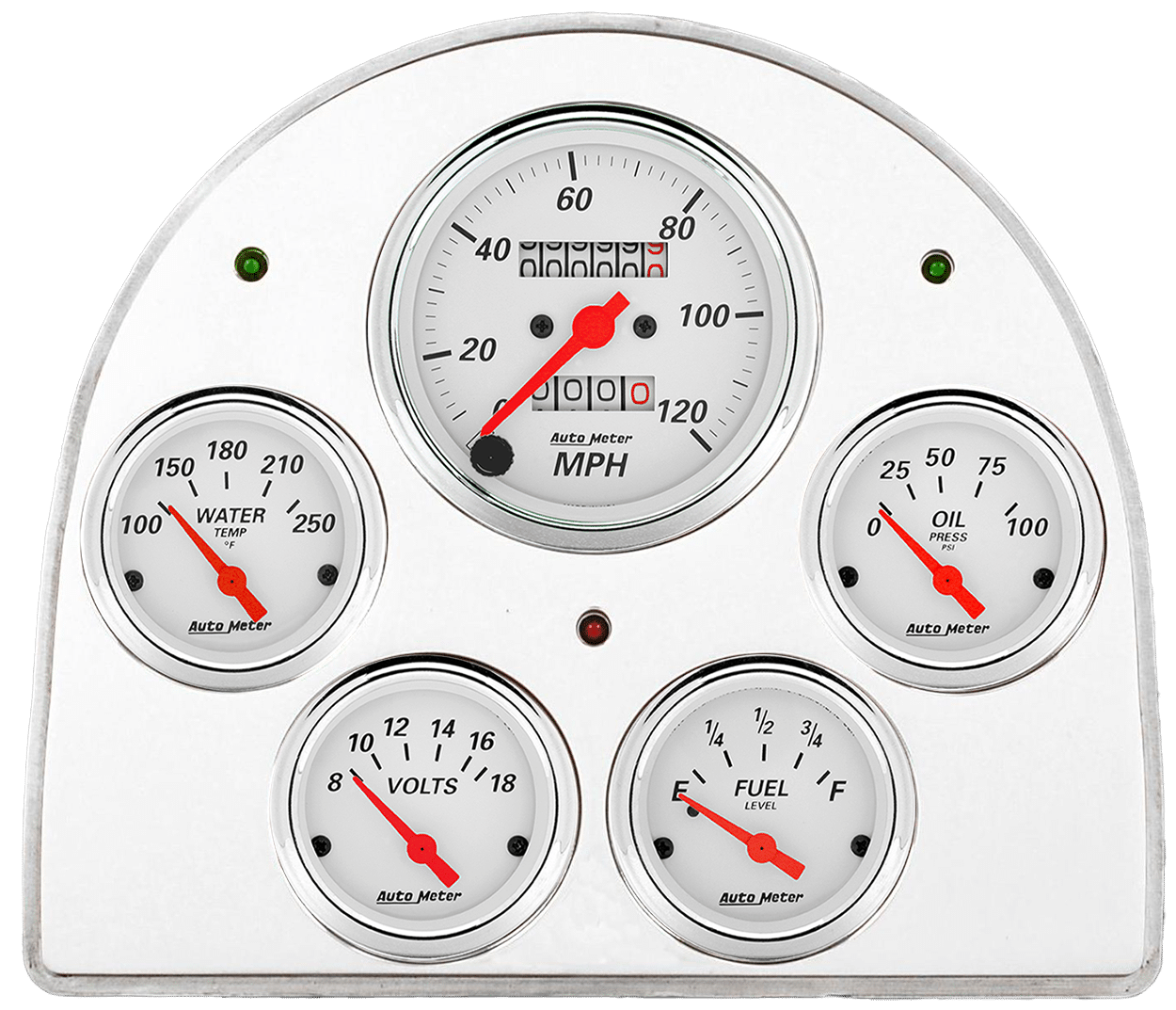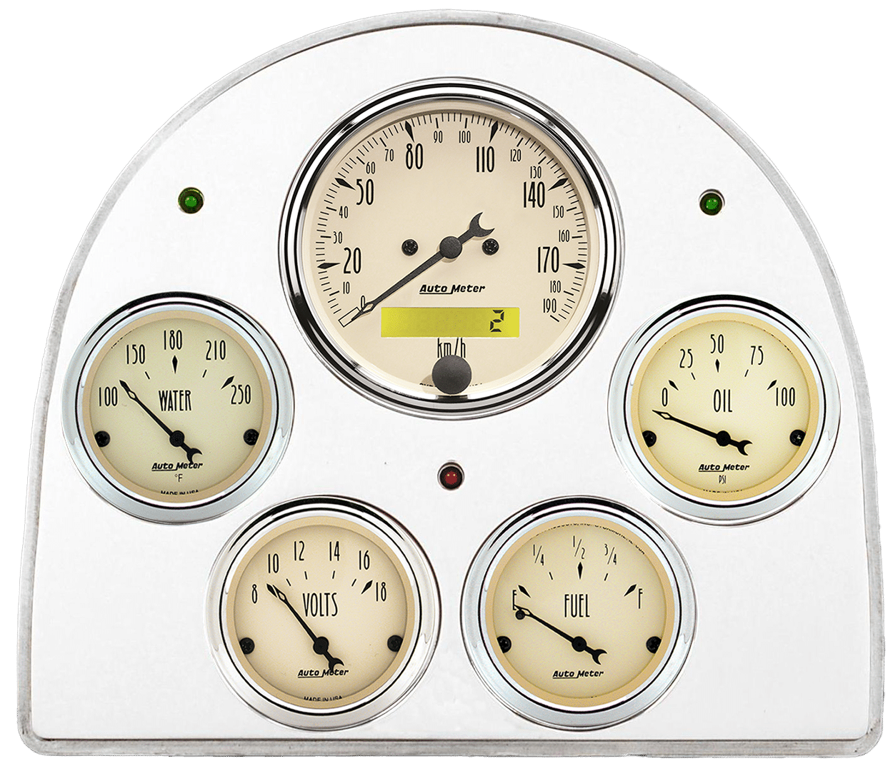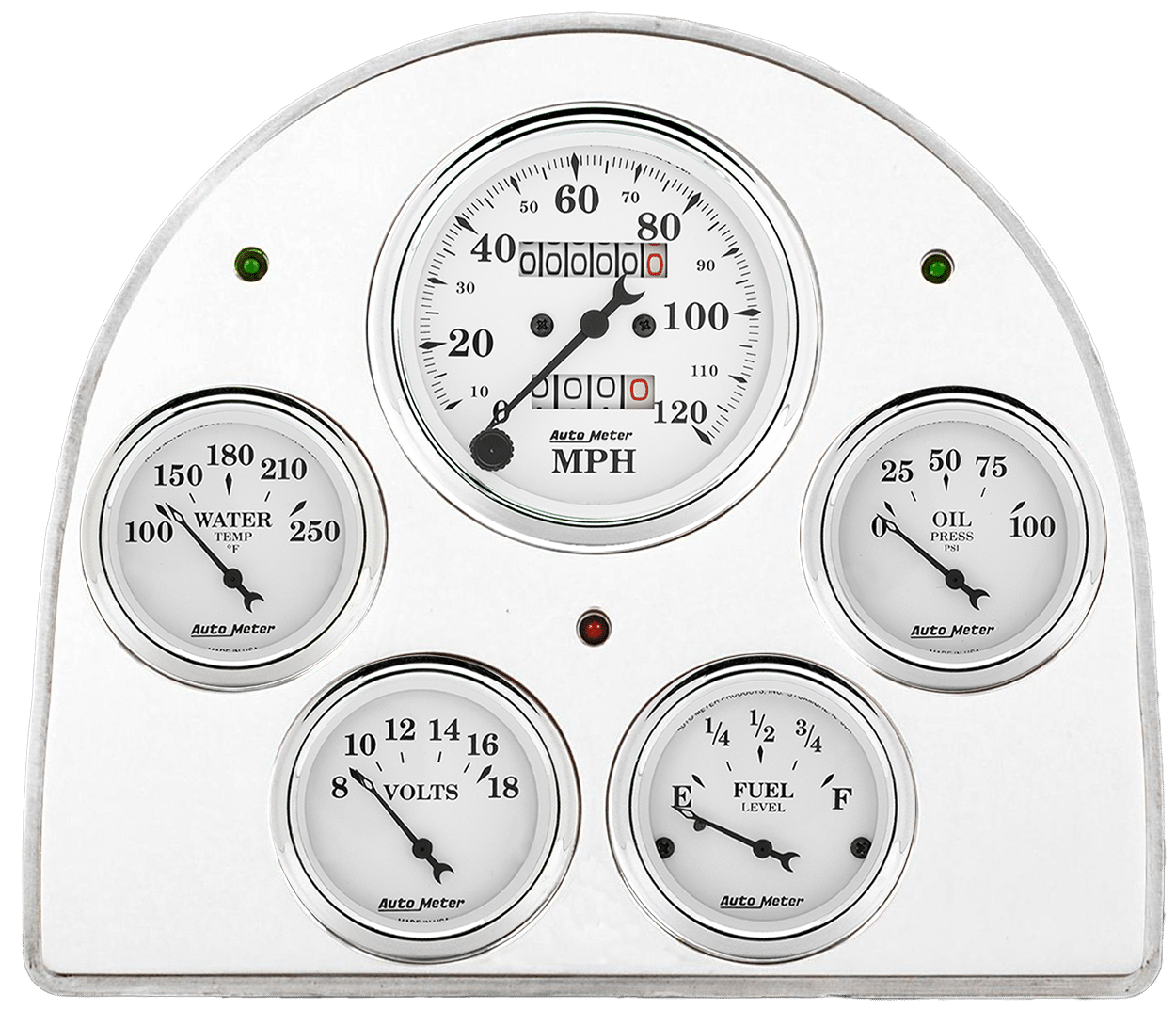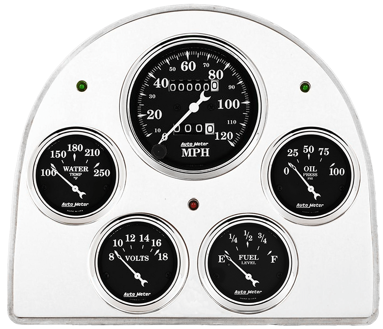 Includes aluminum dash insert, Auto Street Rod series gauges & turn signal/high beam indicators.