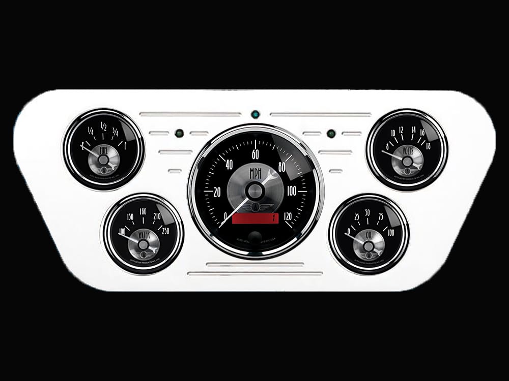 Includes aluminum dash insert, Auto Meter Prestige series gauges & turn signal/high beam indicators.