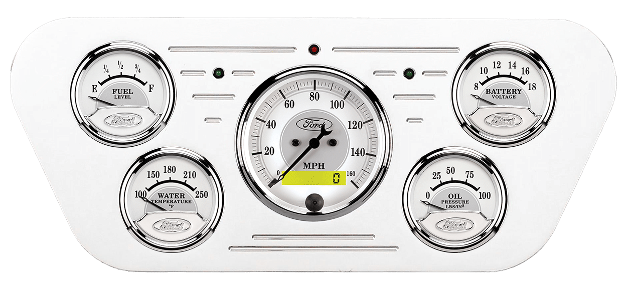 Includes aluminum dash insert, Auto Meter Ford Masterpiece Silver gauges & turn signal/high beam indicators.