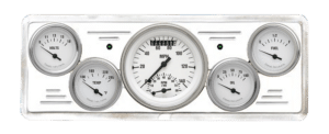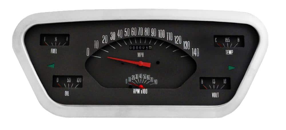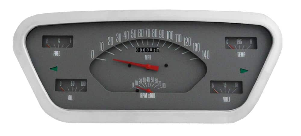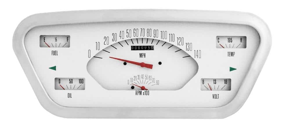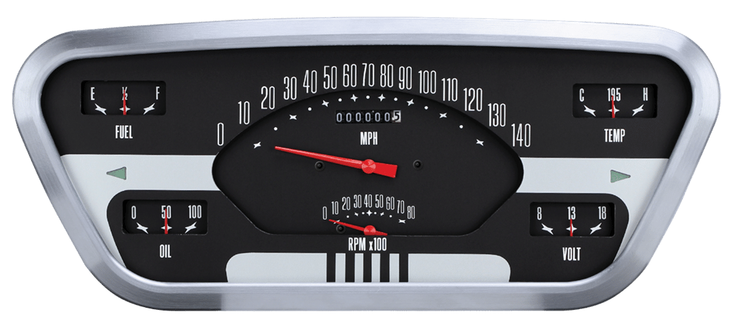 The 53-55 Ford F-100 package features a dual layer design encompassing a speedometer, tachometer, fuel, oil, temp, and volts gauges. This truck package will replace the original instruments in your truck. For an easy installation, this cluster is back-loaded and fastened with four bolts and one clamp. This package is LED lit and includes turn signals as well as a blue halo high beam indicator at the top of the speedometer. With a brushed finish on the billet aluminum bezel, this package will put the finishing touch on your custom vehicle