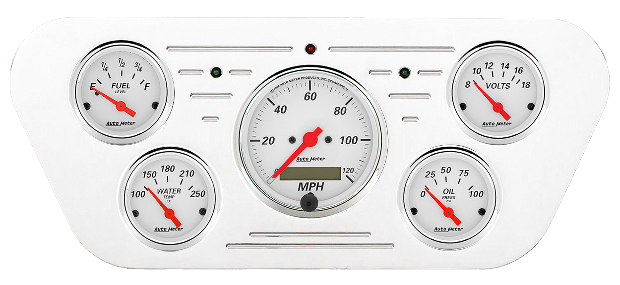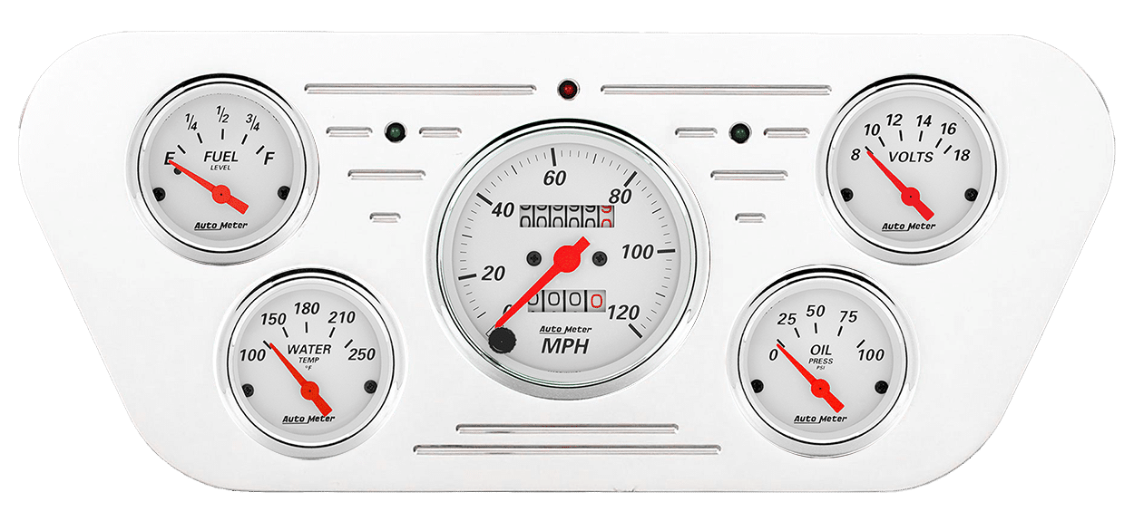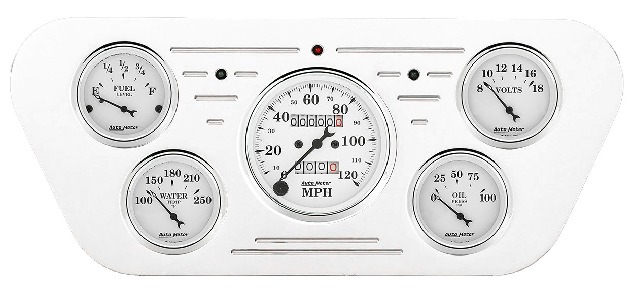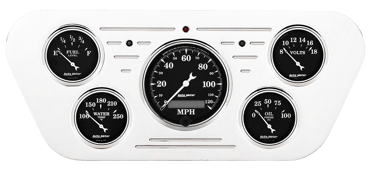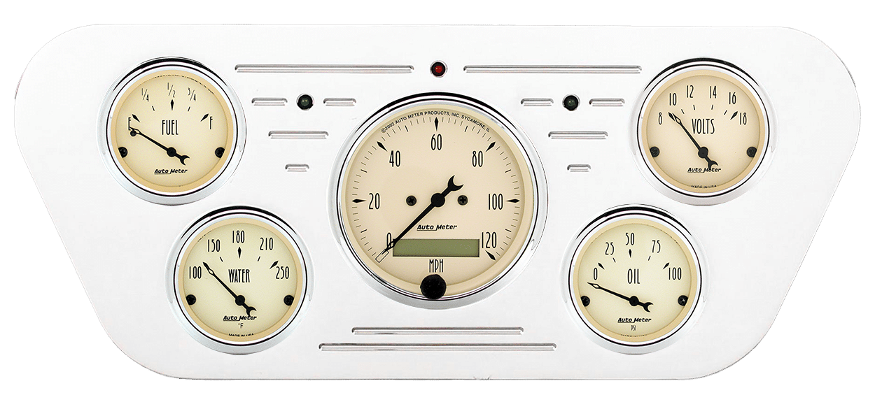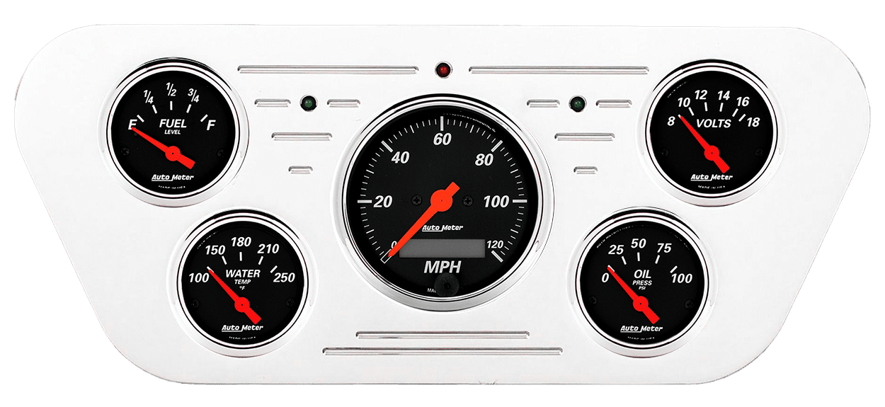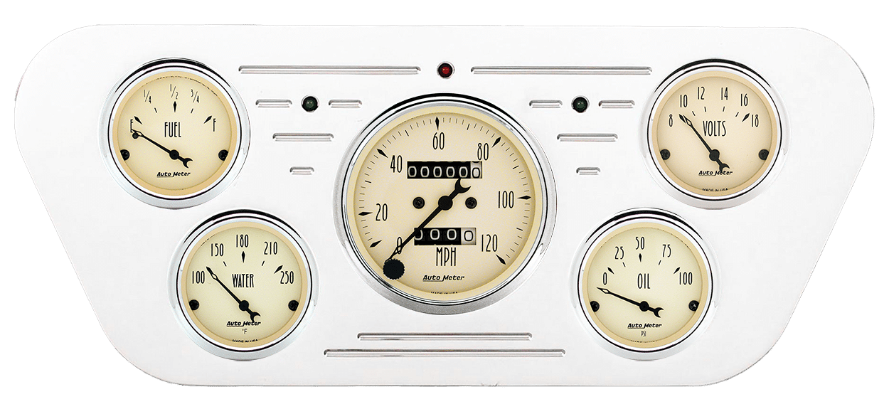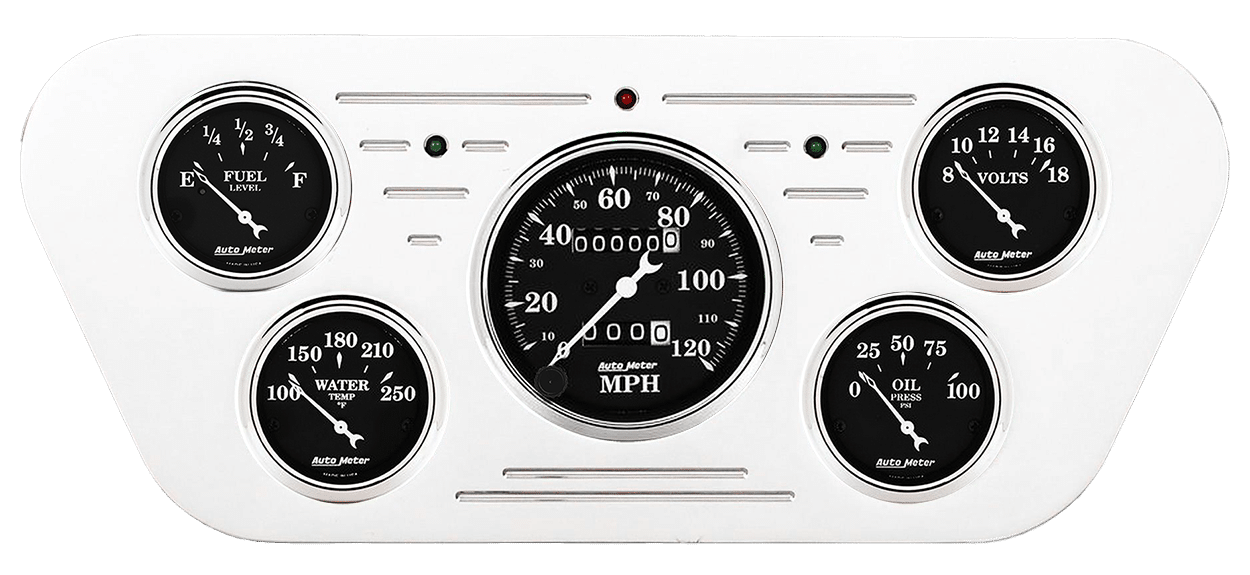 Includes aluminum dash insert, Auto Street Rod series gauges & turn signal/high beam indicators.
