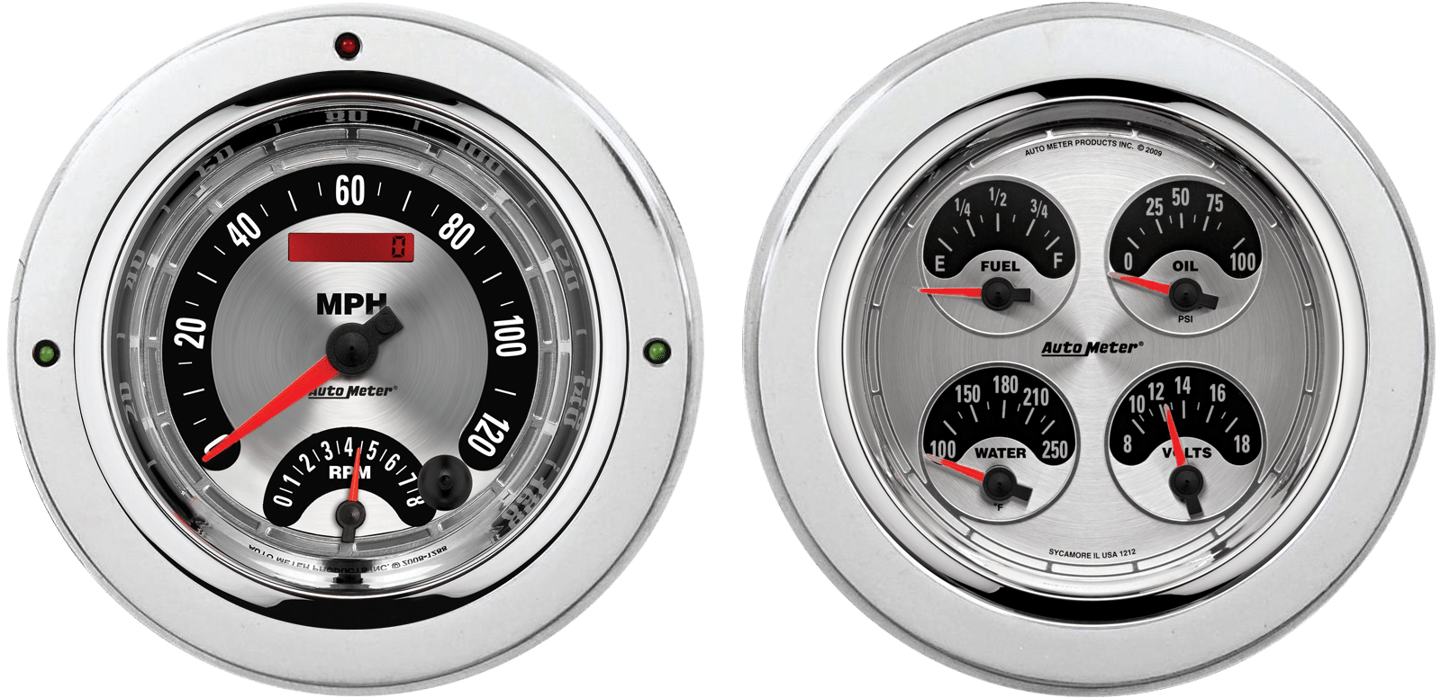 Includes polished aluminum adapter rings, Auto Meter American Muscle 5″ gauges, & LED lights (turn signal & high beam indicators).