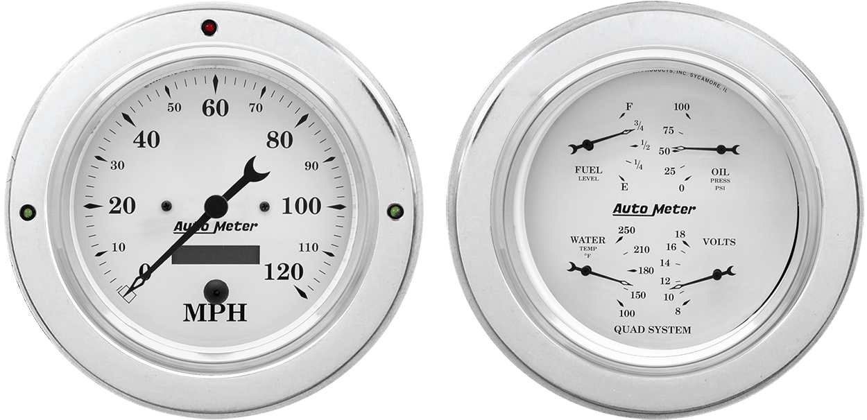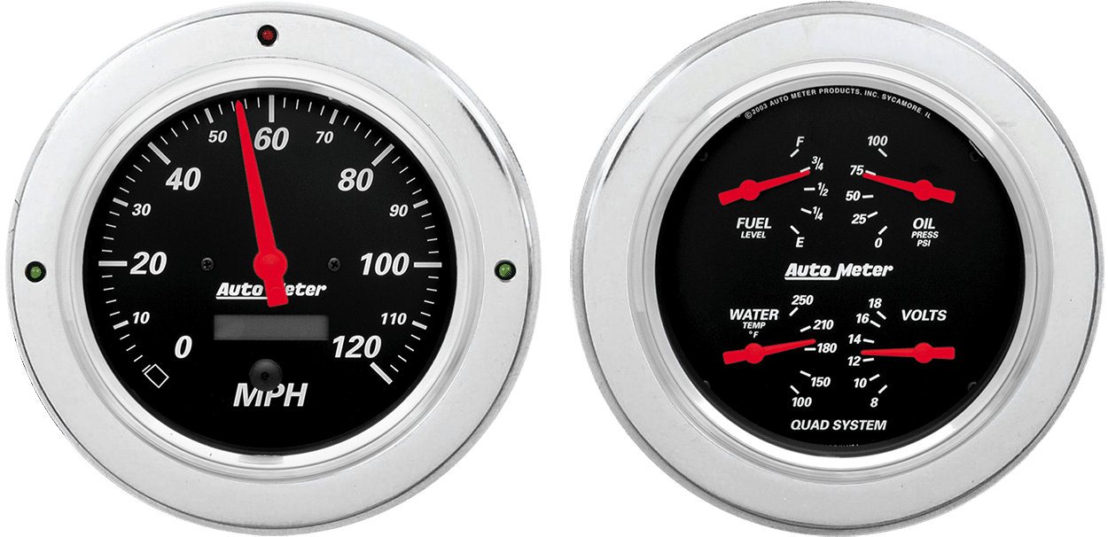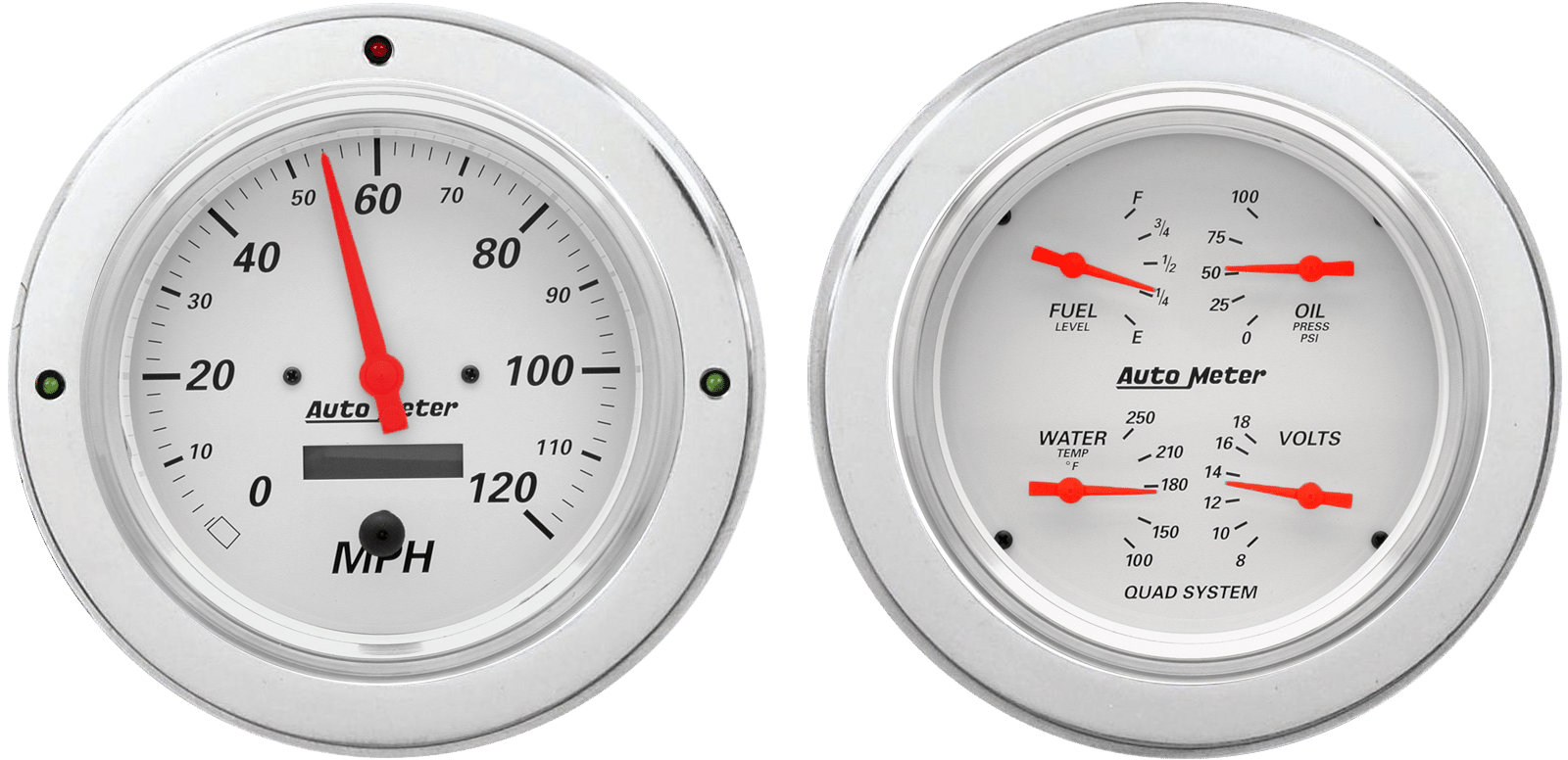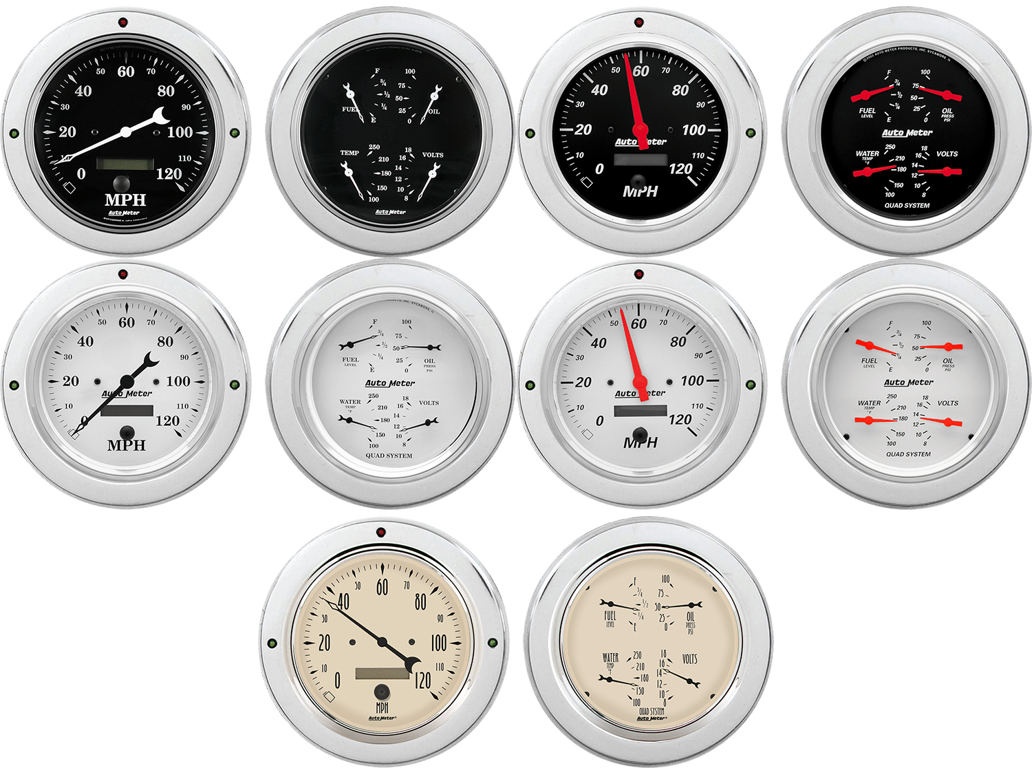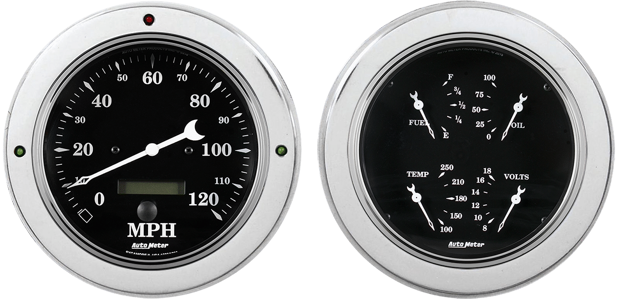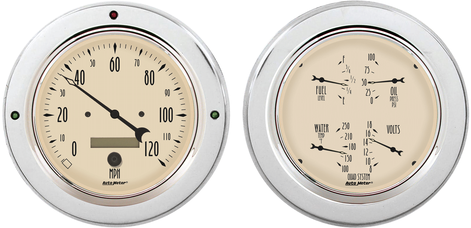 Includes aluminum adapter rings, Auto Meter Street Rod series gauges, & LED lights.