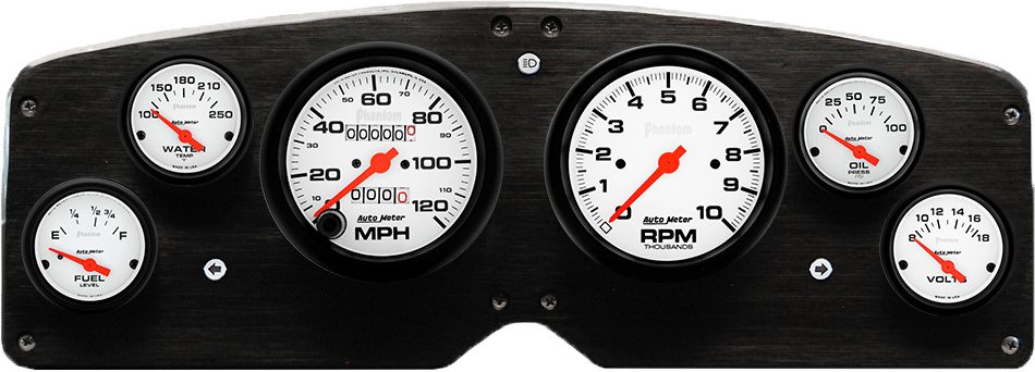 HIncludes aluminum gauge panel, Auto Meter Phantom gauges, & LED lights (turn signal & high beam indicators).