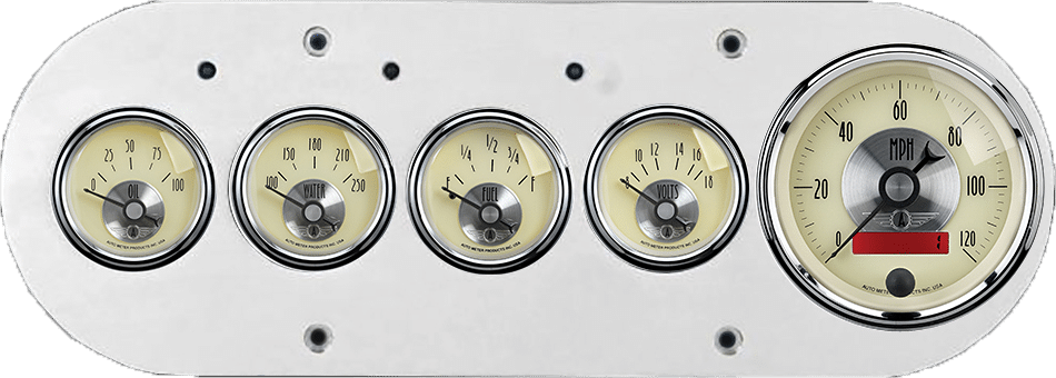 Includes aluminum dash insert, Auto Meter Prestige series gauges & turn signal/high beam indicators.