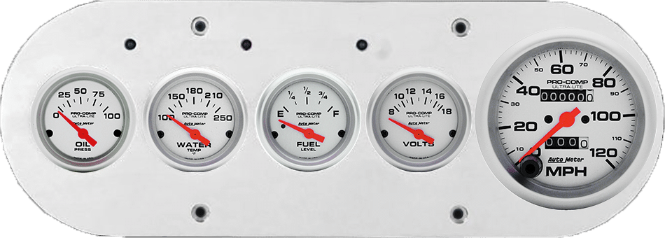 Includes aluminum gauge panel, Auto Meter Ultra-Lite gauges, & LED lights (turn signal & high beam indicators).