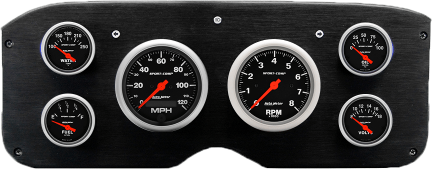 Includes aluminum gauge panel, Auto Meter Sport-Comp gauges, & LED lights (turn signal & high beam indicators).