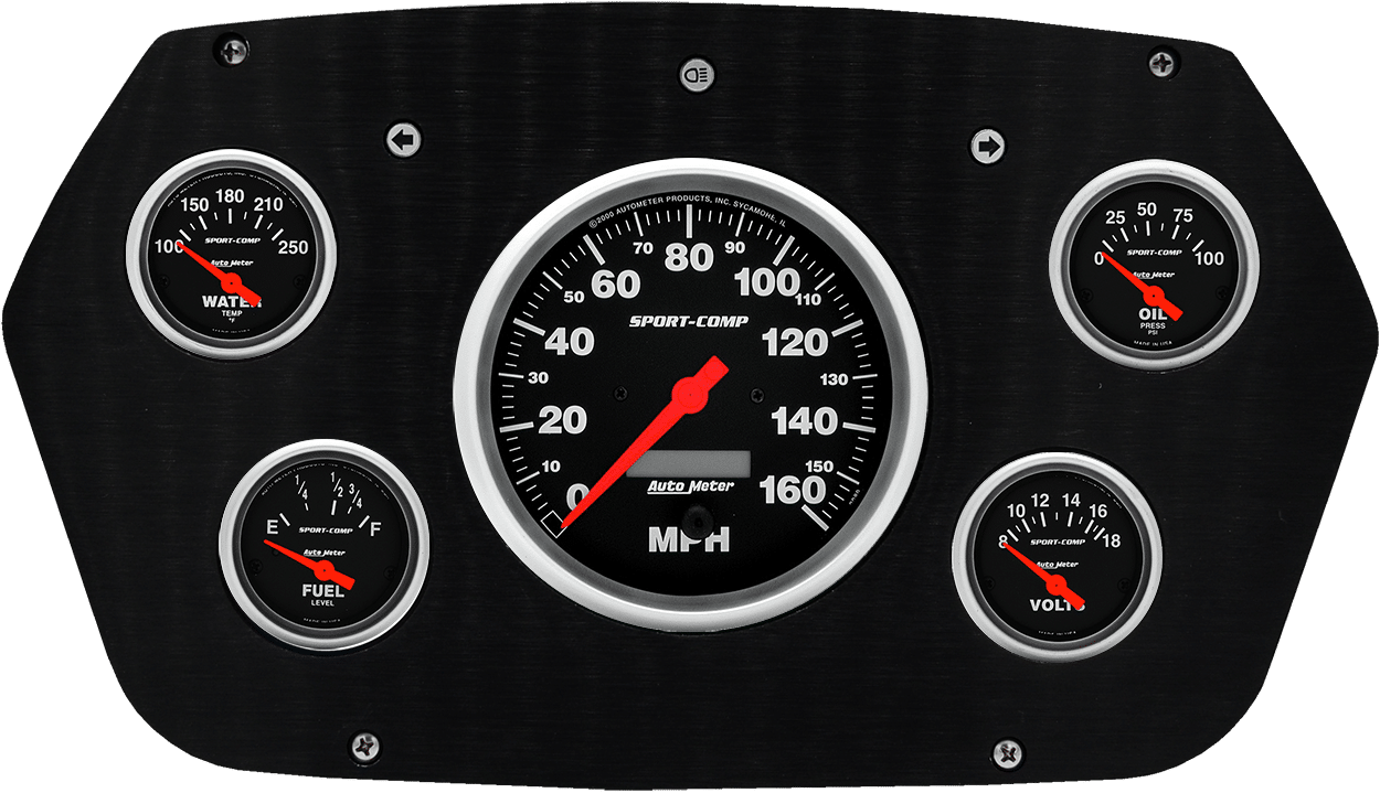 Includes aluminum gauge panel & AutoMeter Sport-Comp gauges.