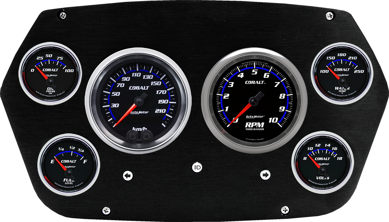Includes aluminum dash insert, Auto Meter Cobalt gauges, & turn signal/high beam indicators.