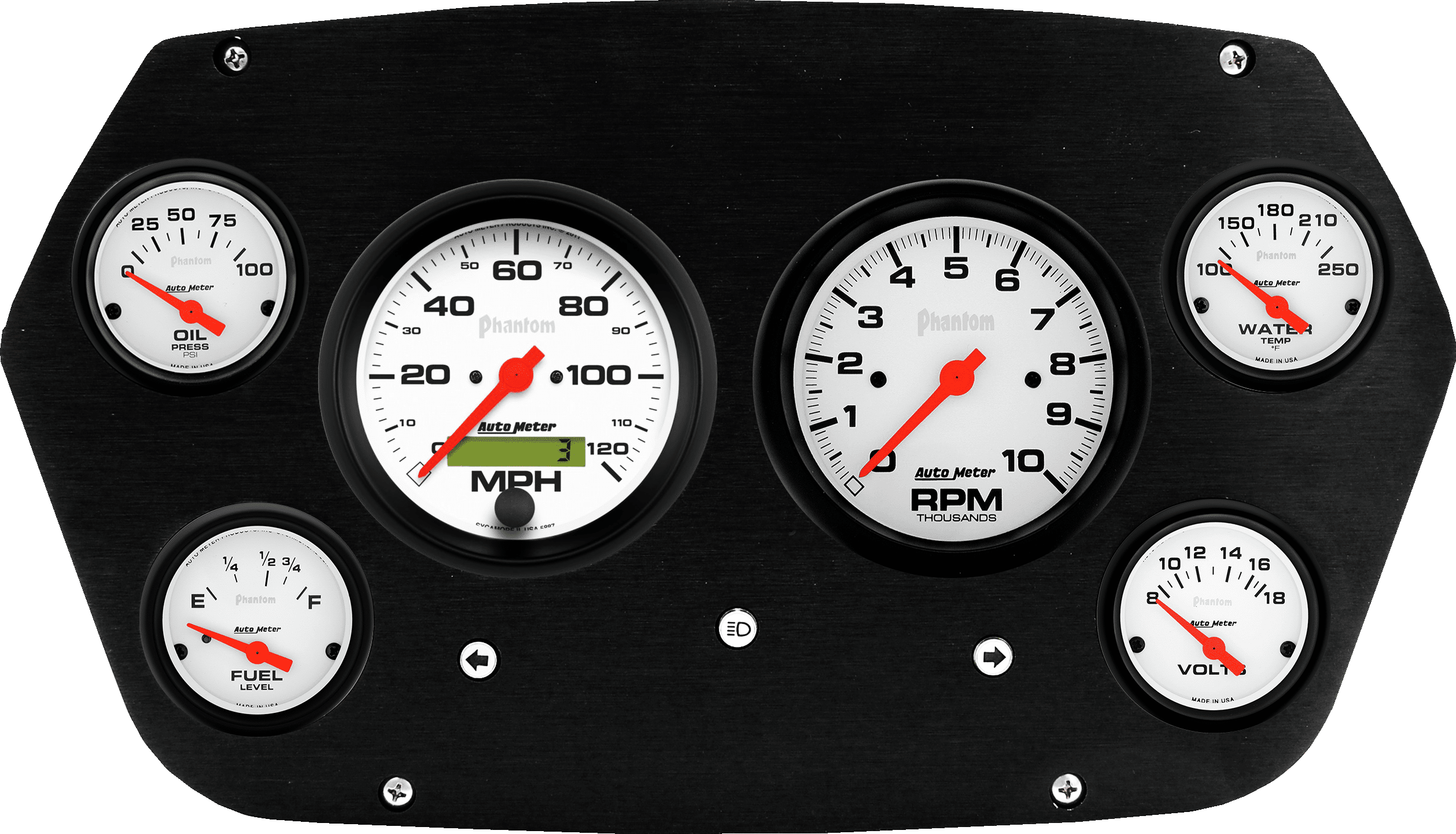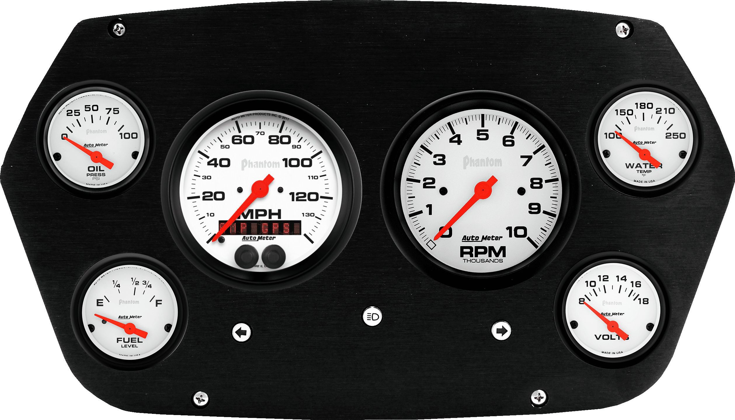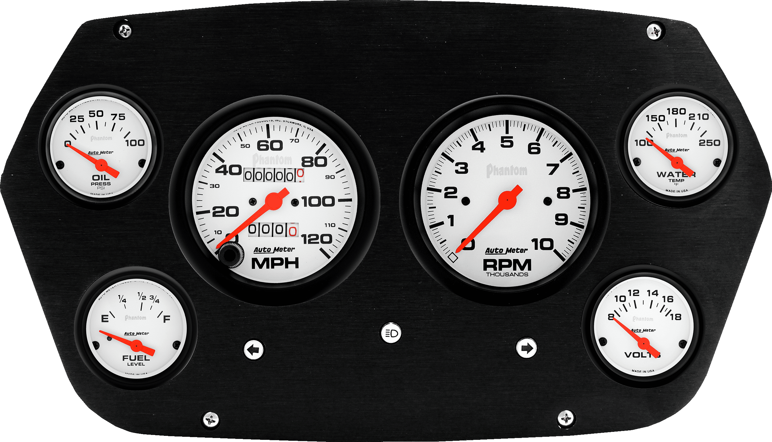 Includes aluminum gauge panel, Auto Meter Phantom gauges, & LED lights (turn signal & high beam indicators).