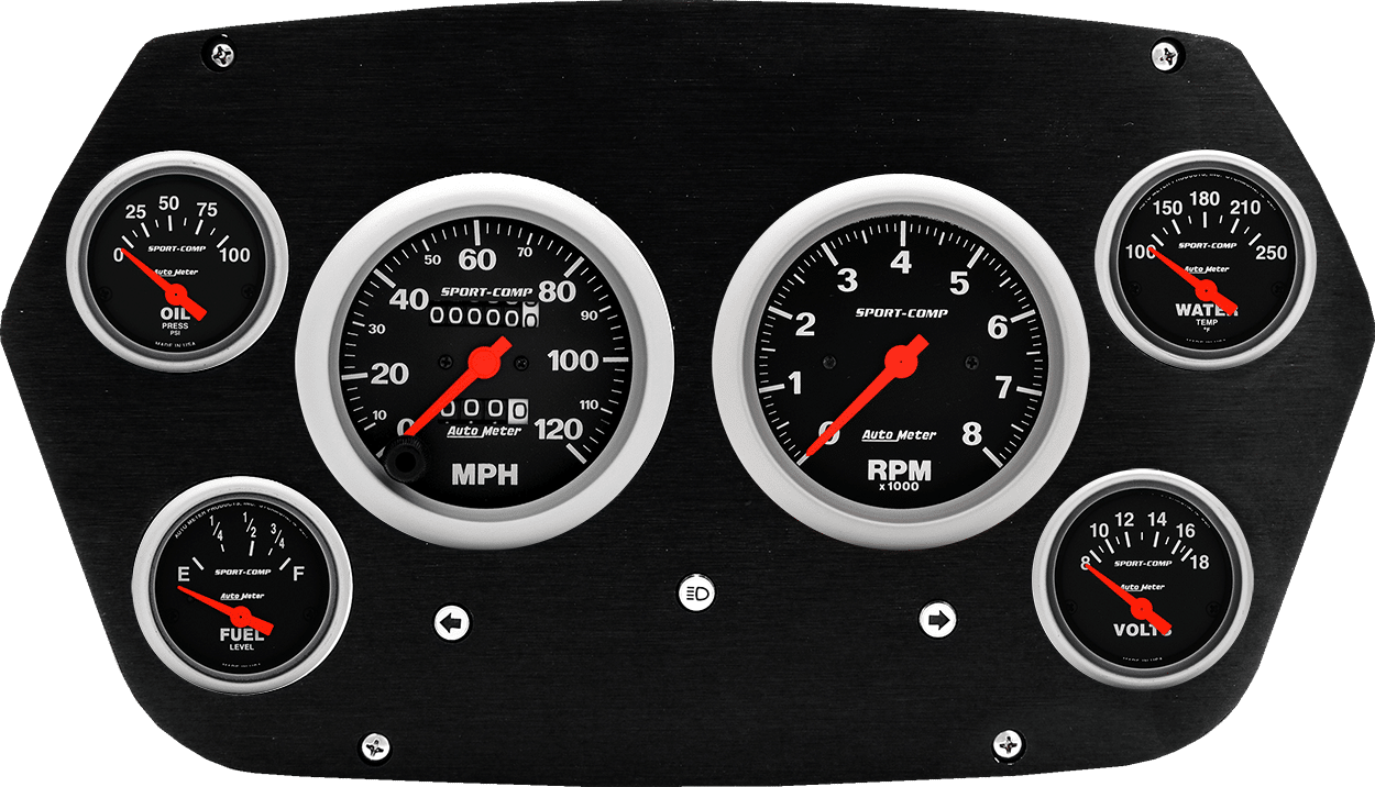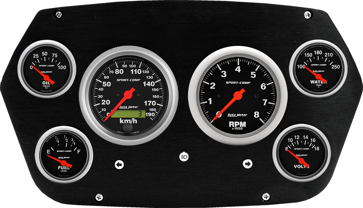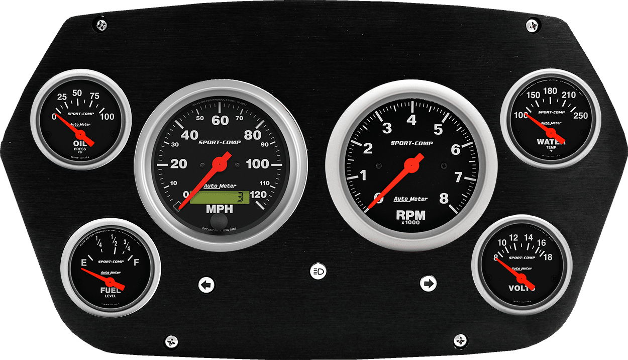 Includes aluminum gauge panel, Auto Meter Sport-Comp gauges, & LED lights (turn signal & high beam indicators).