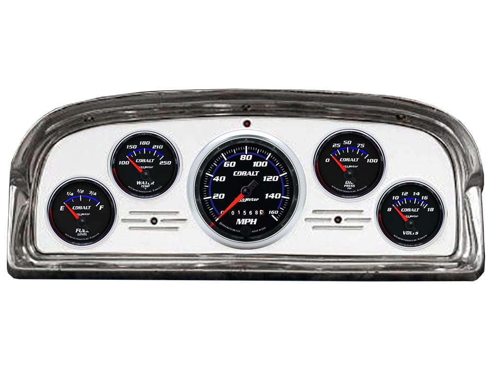 Includes aluminum dash insert, Auto Meter Cobalt gauges, & turn signal/high beam indicators.