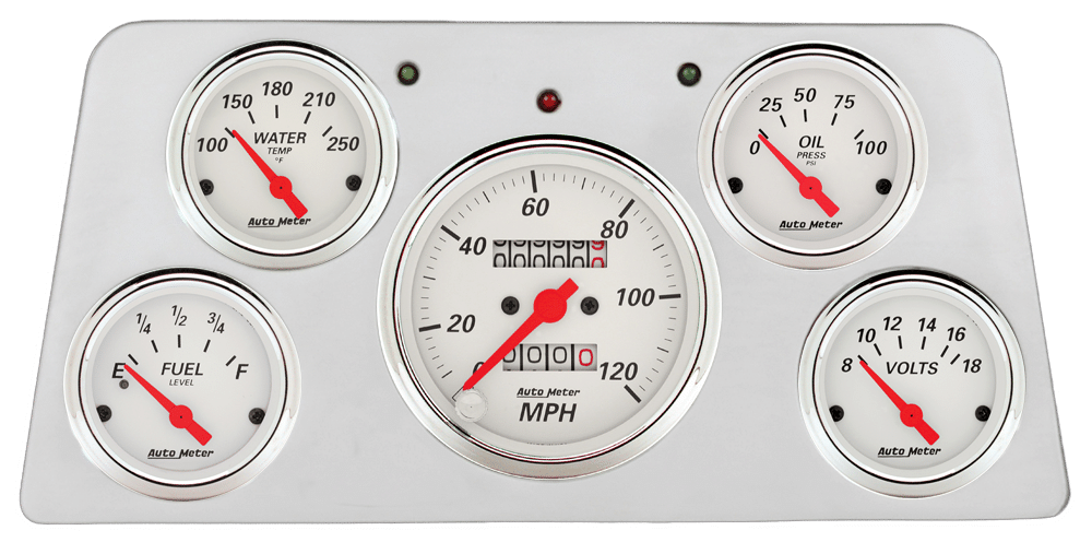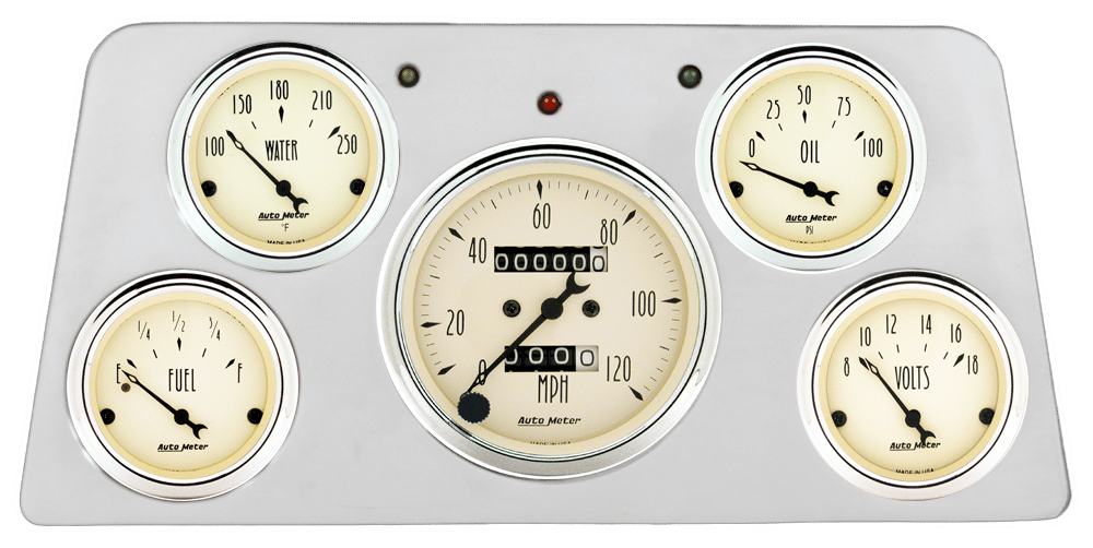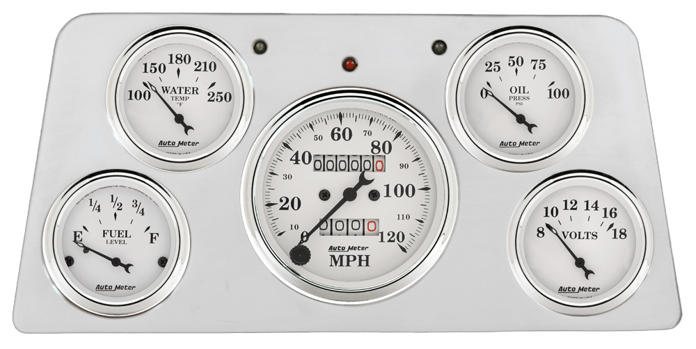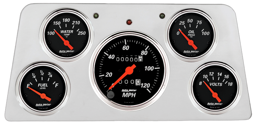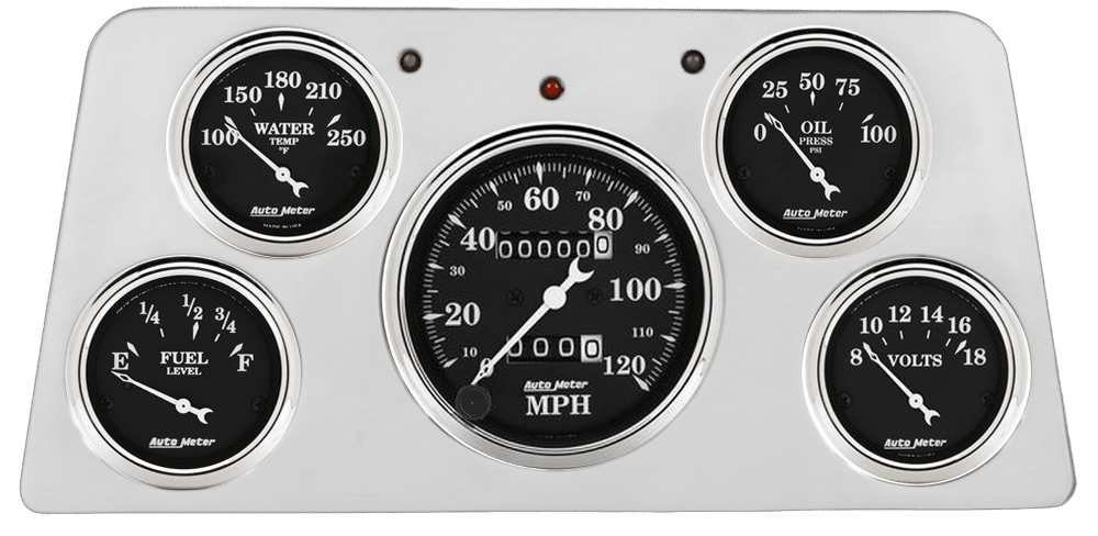 Includes aluminum dash insert, Auto Street Rod series gauges & turn signal/high beam indicators.