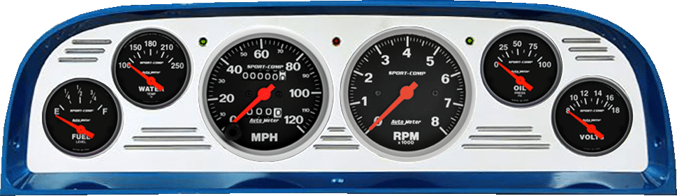 Includes aluminum gauge panel, Auto Meter Sport-Comp gauges, & LED lights (turn signal & high beam indicators).