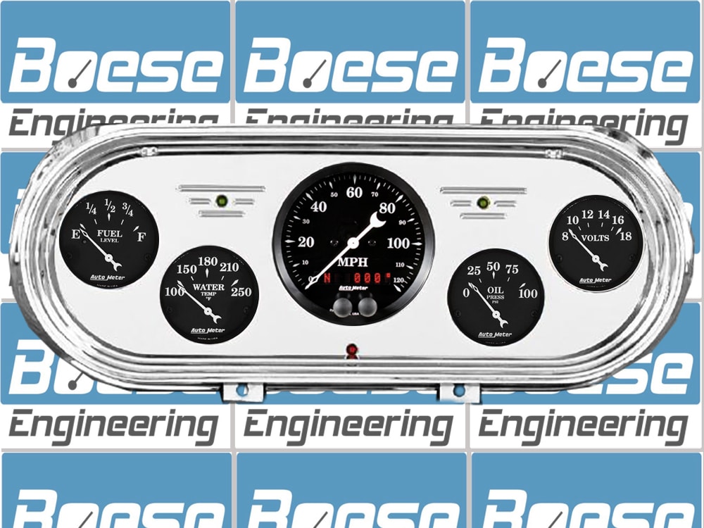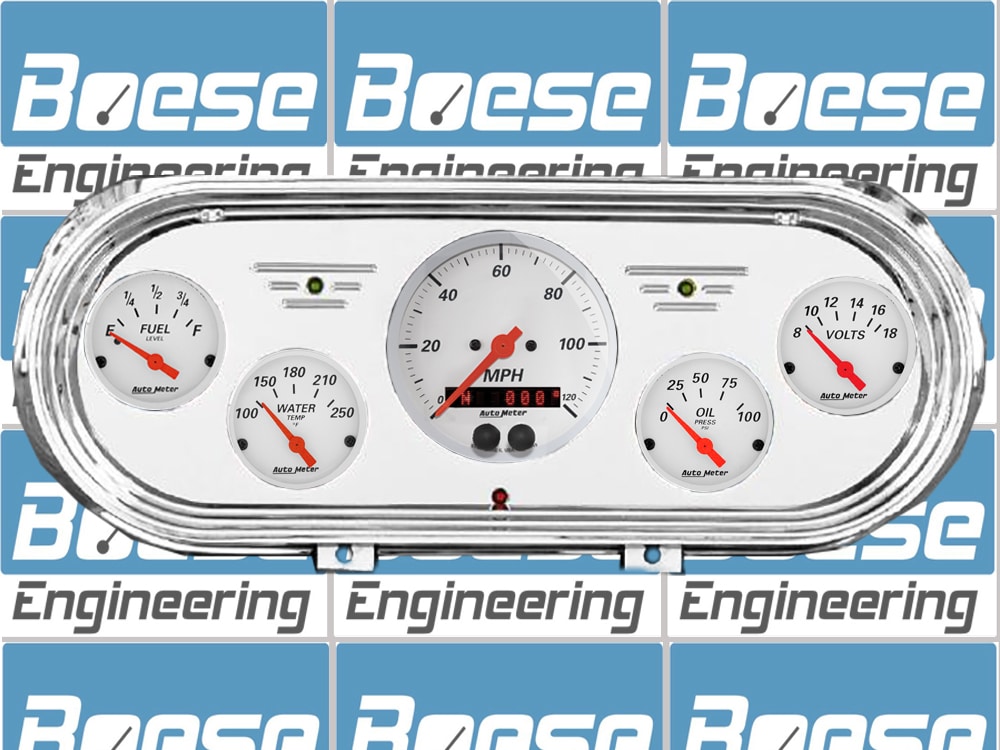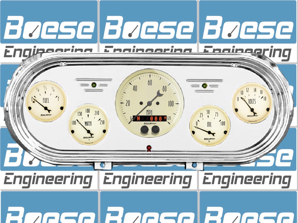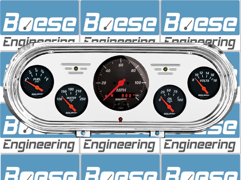 Includes aluminum dash insert, Auto Meter Street Rod series gauges and LED lights (turn signal & high beam indicators.).