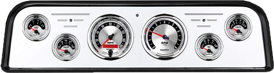 Includes aluminum gauge panel, Auto Meter American Muscle gauges, & LED lights (turn signal & high beam indicators).