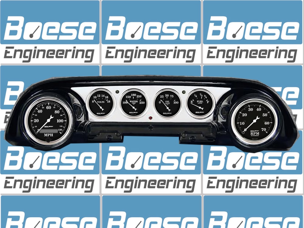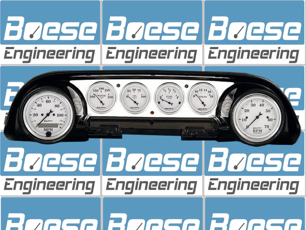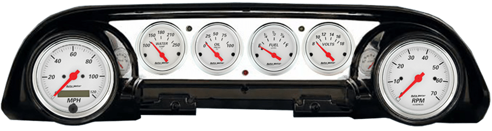 Includes aluminum gauge panel, Auto Meter Street Rod series gauges, & turn signal/high beam indicators.