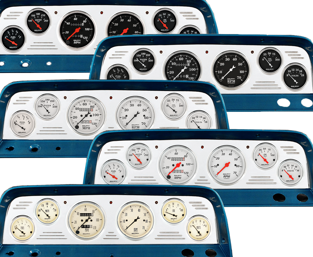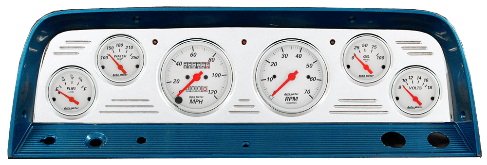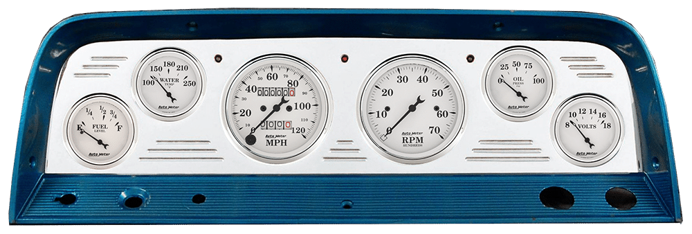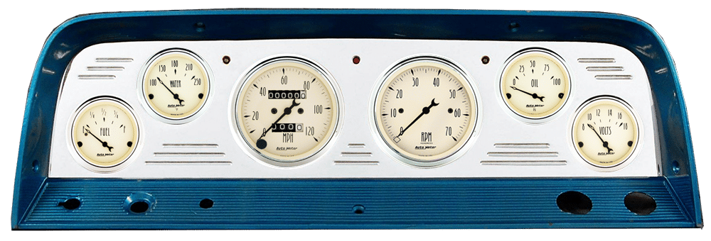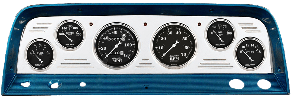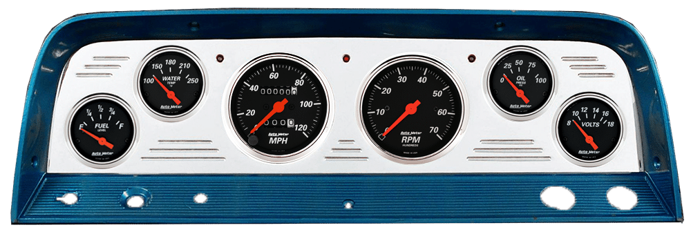 Includes aluminum dash insert, Auto Street Rod series gauges & turn signal/high beam indicators.