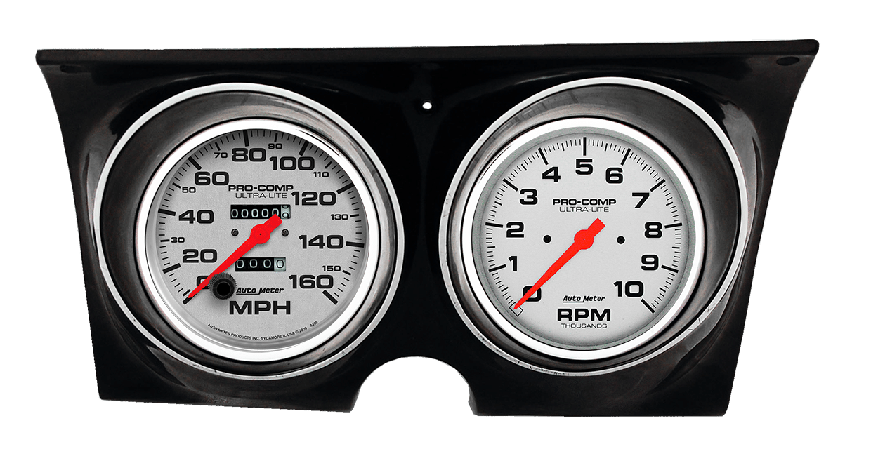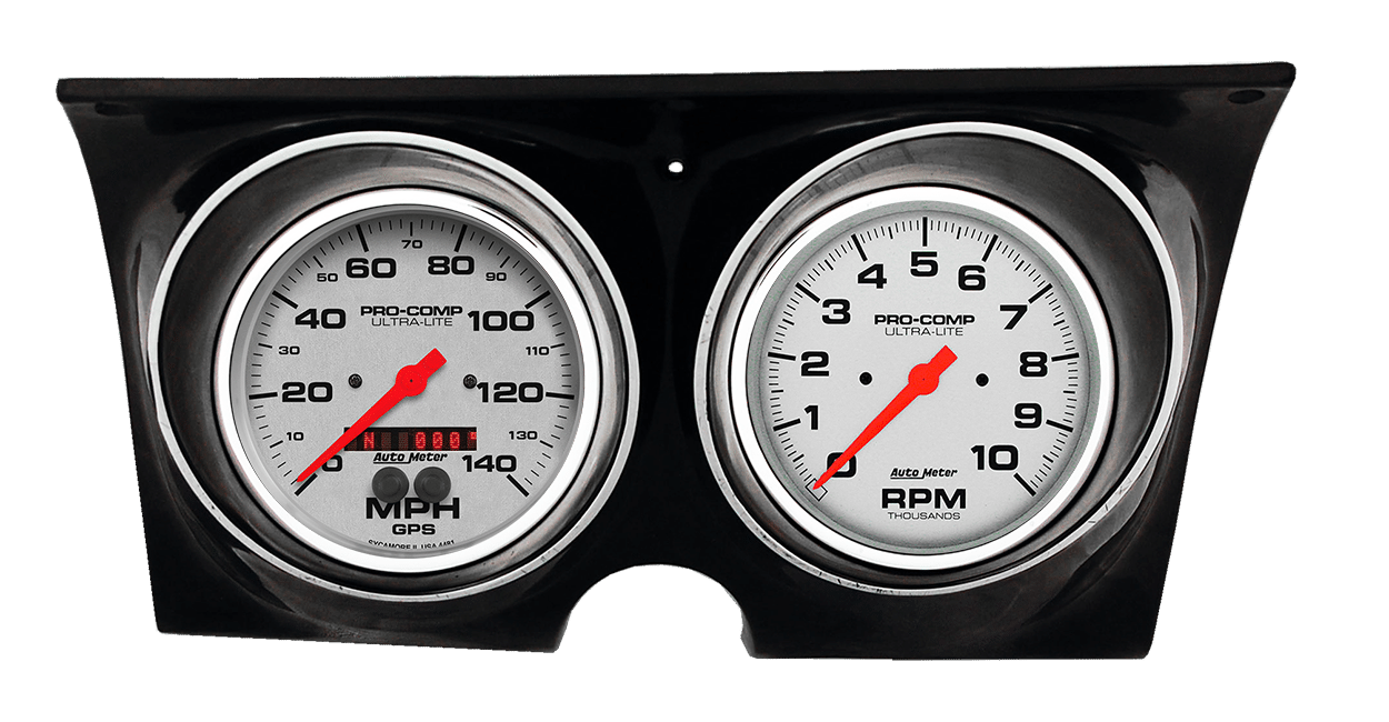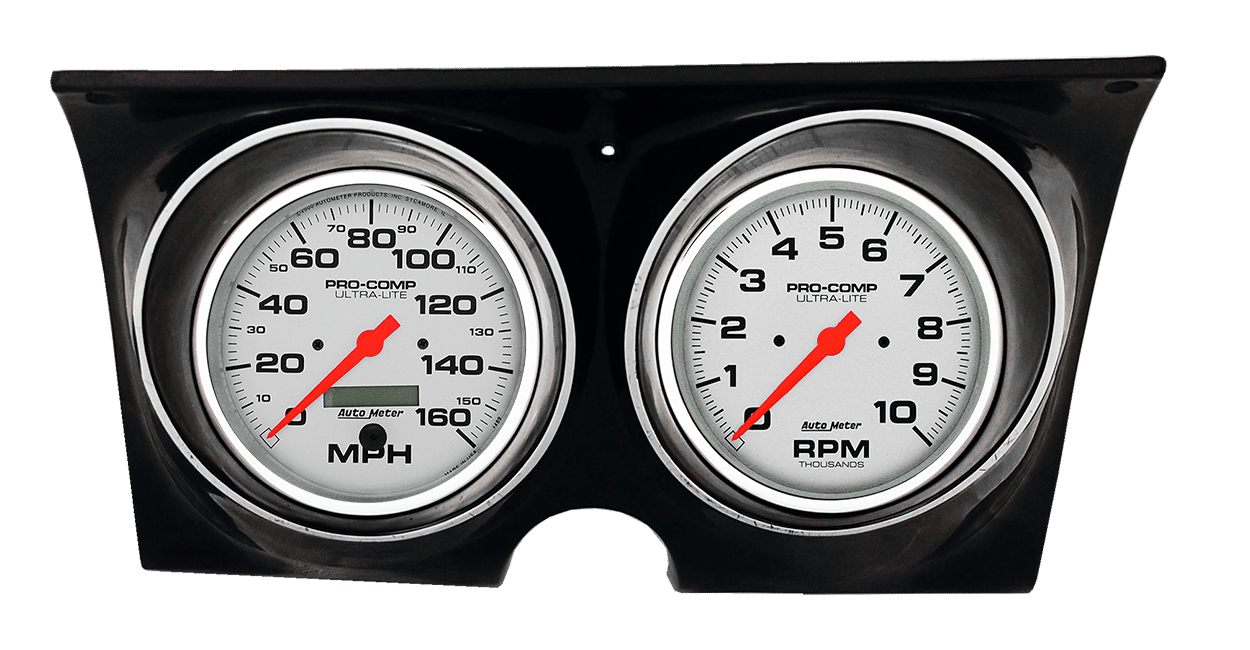 Includes aluminum adapter rings & Auto Meter Ultra-Lite gauges. Gauges include:- 5″ speedometer (choose from drop down list)