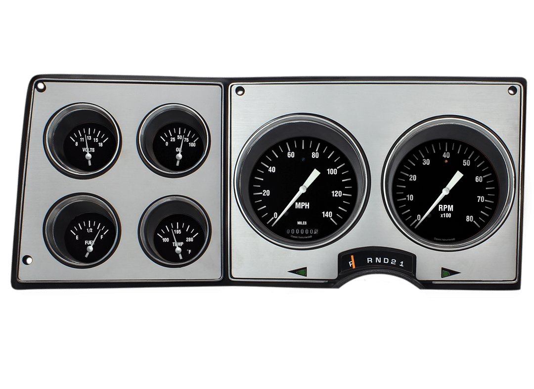 The Hot Rod 1973-87 Chevy/GMC direct-fit cluster features a speedometer and tachometer, and fuel, oil, temperature, and volt gauges in our timeless Hot Rod series. The all-electric cluster arrives ready to install directly into the stock dash of 73-87 trucks, Suburbans, and Blazers, with ease; no cutting or alterations necessary. It is designed to re-use the factory dash bezel and gear indicator to maintain the nostalgic integrity of the vehicle. Additionally, the turn signals are in the stock location and it is designed so light reaches the gear indicator. Everything needed to install the package is provided in the kit including a new lens and all necessary sending units. The cluster is designed to reuse the stock fuel sending unit or any aftermarket fuel sender (purchased separately) with the built-in ohm range selector switch. Whether you want to freshen up your stock look, or call us for customizations to make it your very own, our 1973-87 Chevy/GMC direct-fit cluster offers the perfect seamless installation you desire.Mounts into stock bezel (not included).